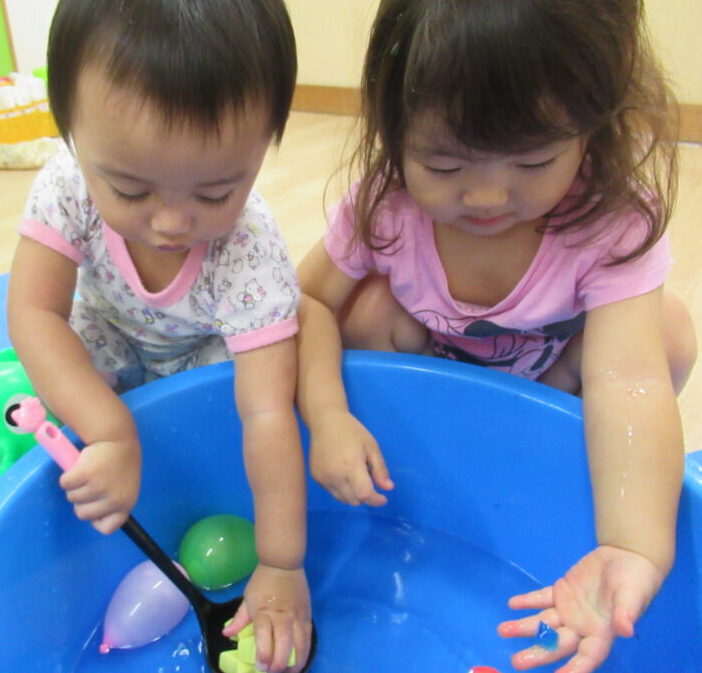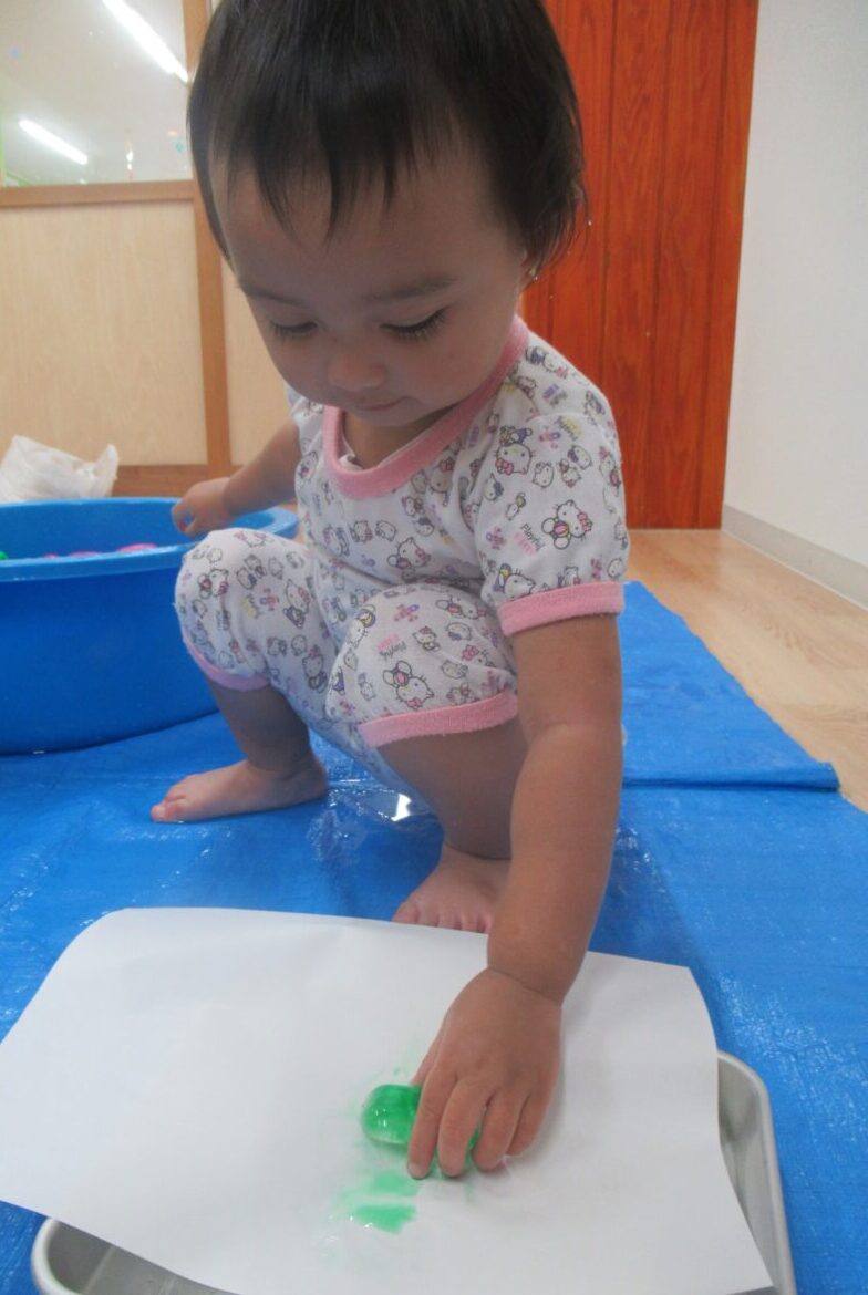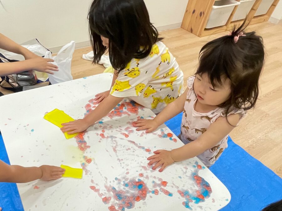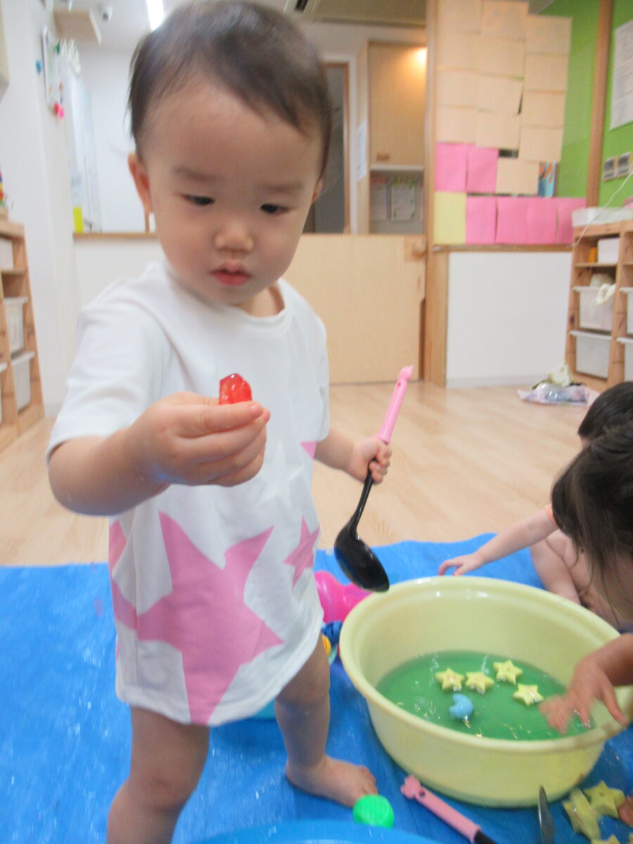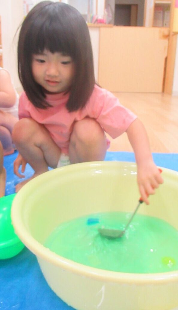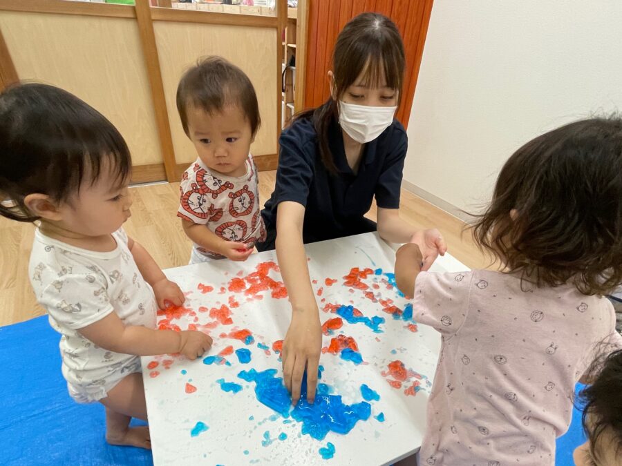 何かわからず不思議そうに戸惑っている子もいましたが、積極的に寒天を触って遊ぶお友だちや先生と一緒に触れることで安心して遊び始めました。