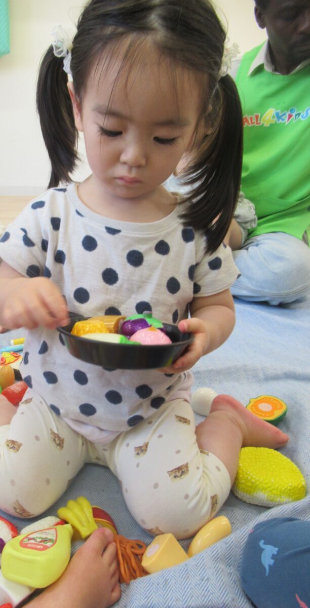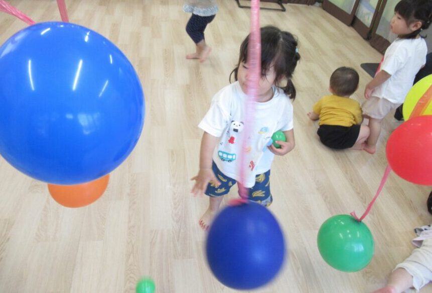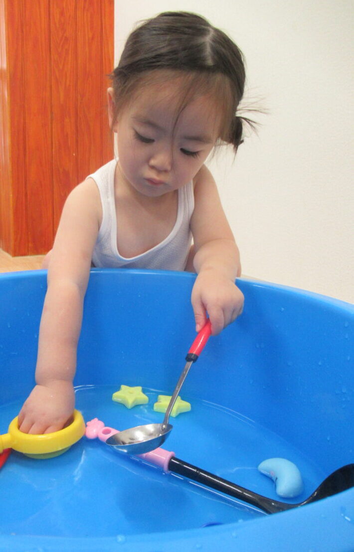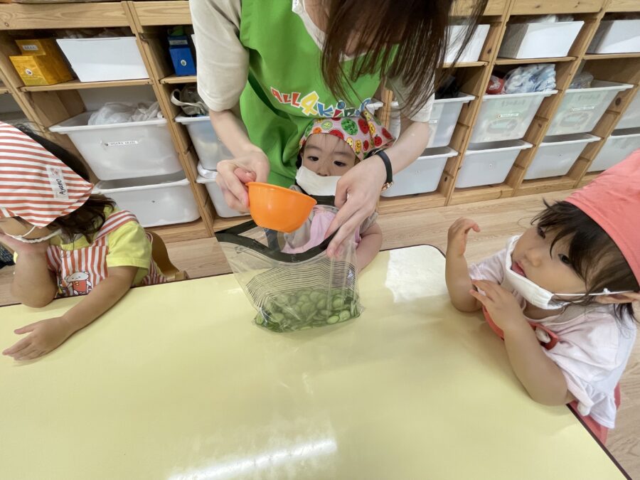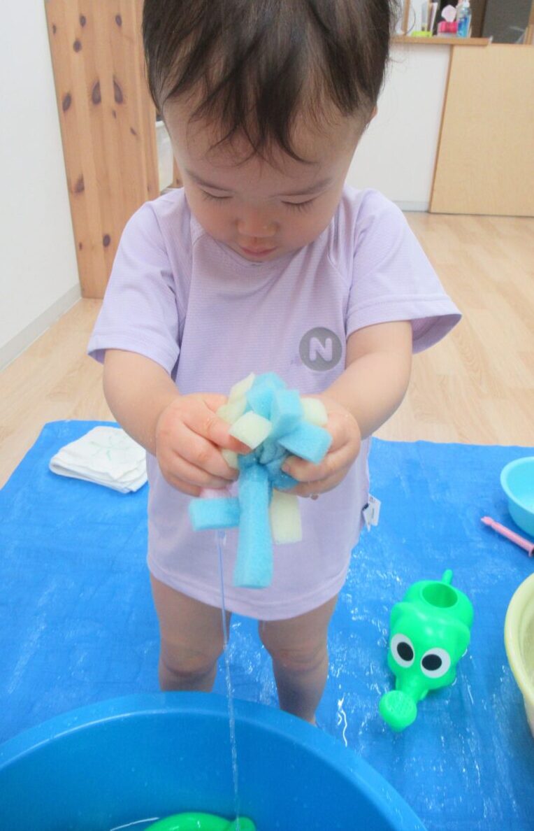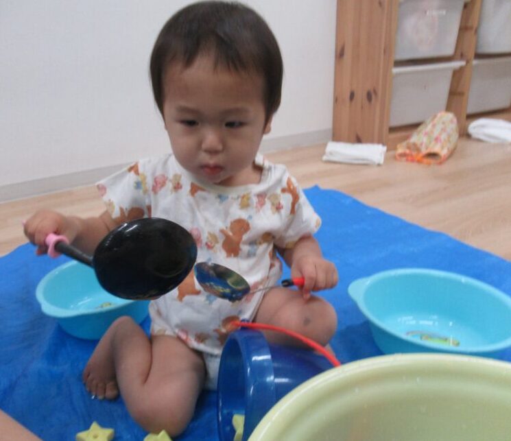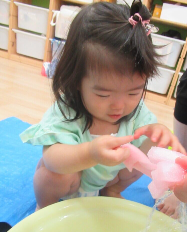 何かわからず不思議そうに戸惑っている子もいましたが、積極的に寒天を触って遊ぶお友だちや先生と一緒に触れることで安心して遊び始めました。