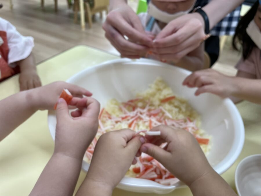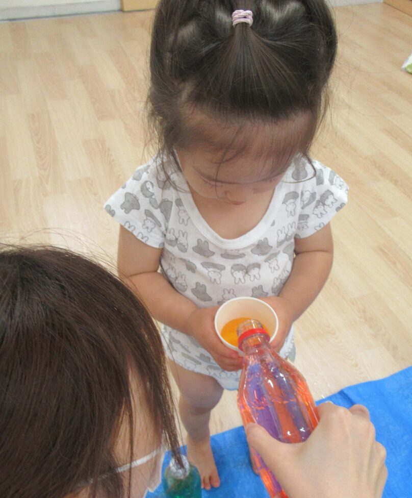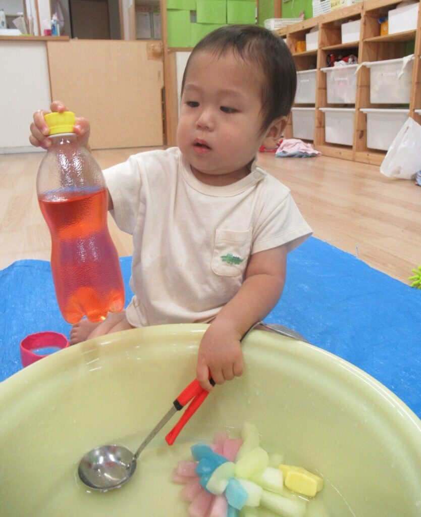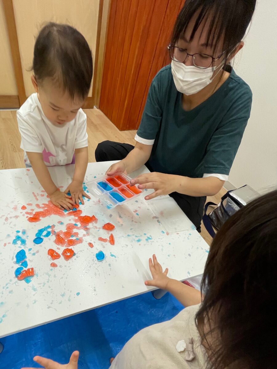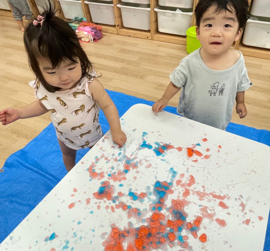 寒天を手でつぶす感触や混ぜて色が変わる様子を楽しんだよ。
