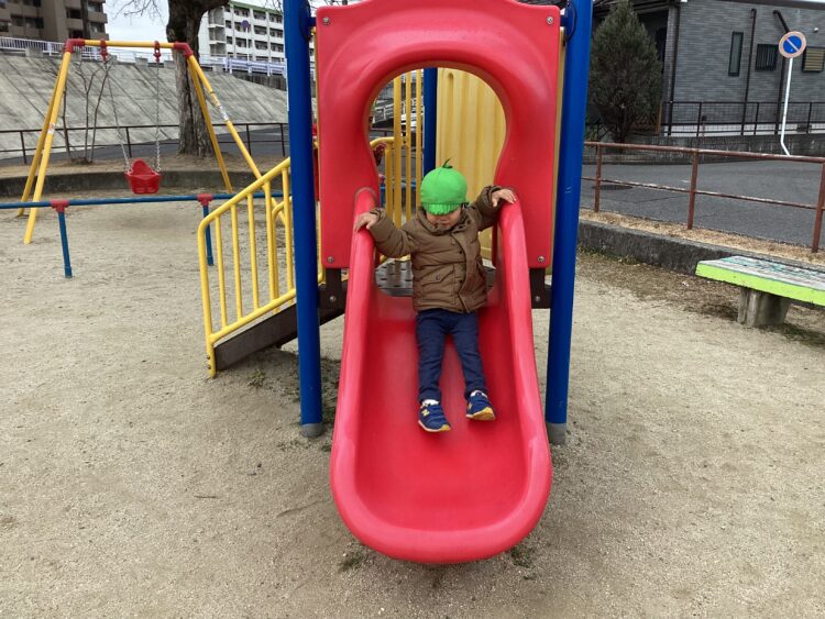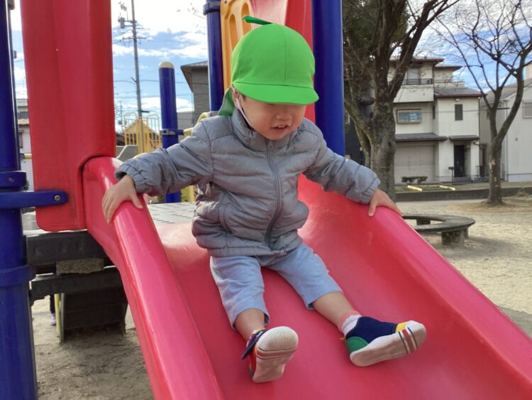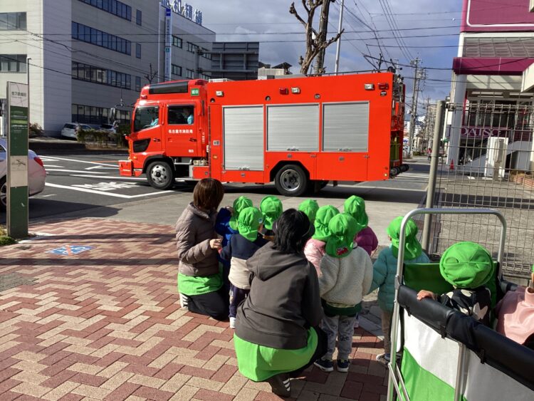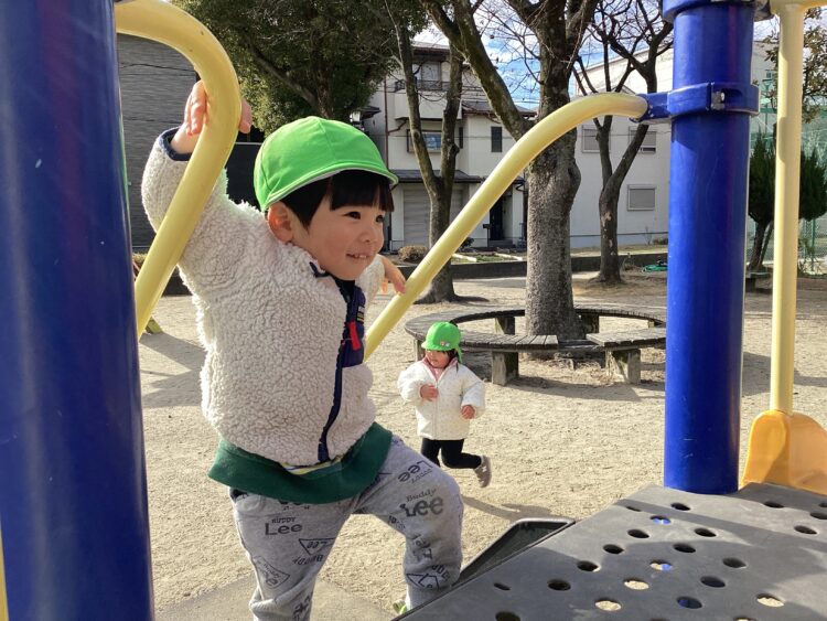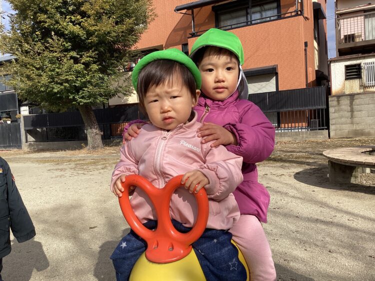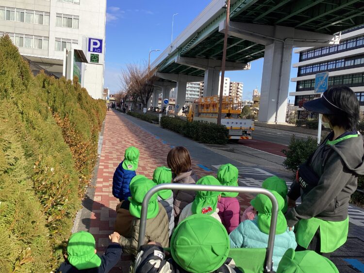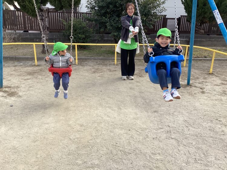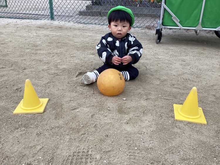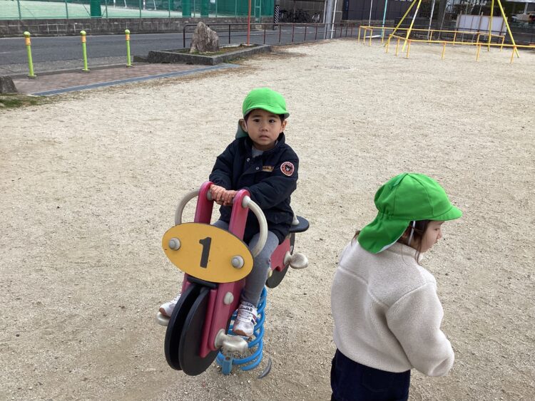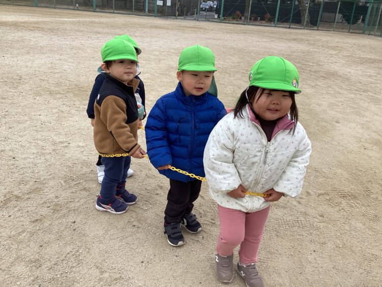 グラウンドへお出かけしたお友だちは、お散歩カートを先頭に電車ごっこをしたり、