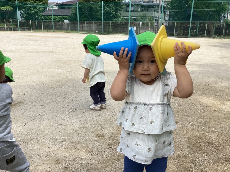 三角コーンをツノに見立てて保育者の方を見てニッコリ😄