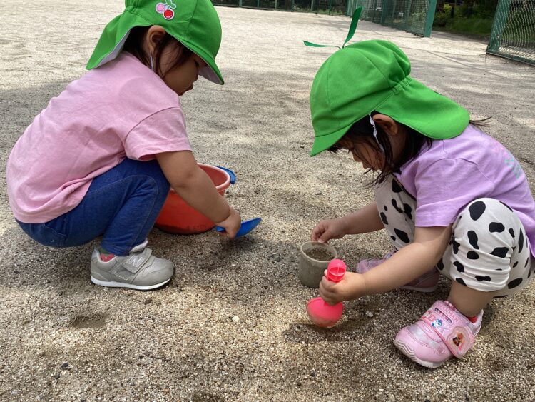 スコップで砂をすくってバケツやカップに入れてご馳走を作ったり、型抜きをしたりして砂の感触を味わいながら楽しんでいました🎵
