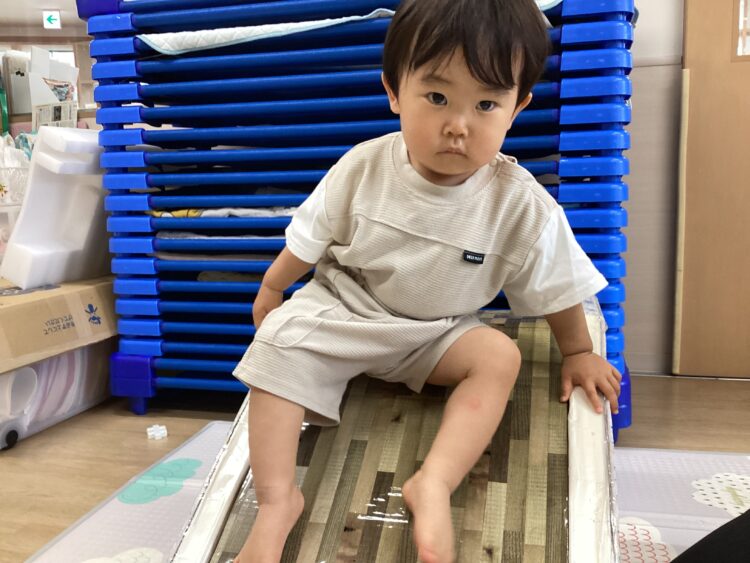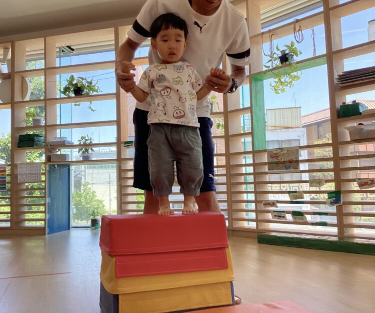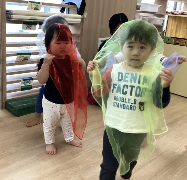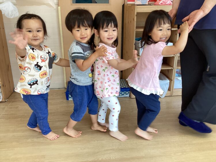 先生が電車になっていると「のせてくださーい!」「〇〇ちゃんも!」とみんなで連結して、室内を走って楽しんでいました😄