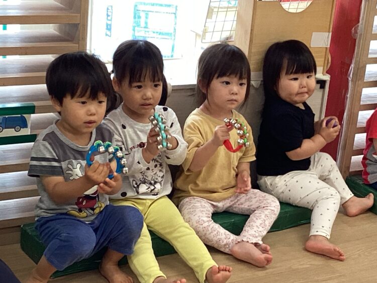 合奏では、“あめふりくまのこ”の歌に合わせて鈴やエッグマラカスを鳴らして楽しみました🎵