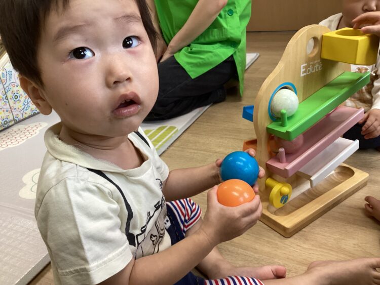 スロープトイは4つのボールを友だちと分け合って一緒に楽しんでいました🎵