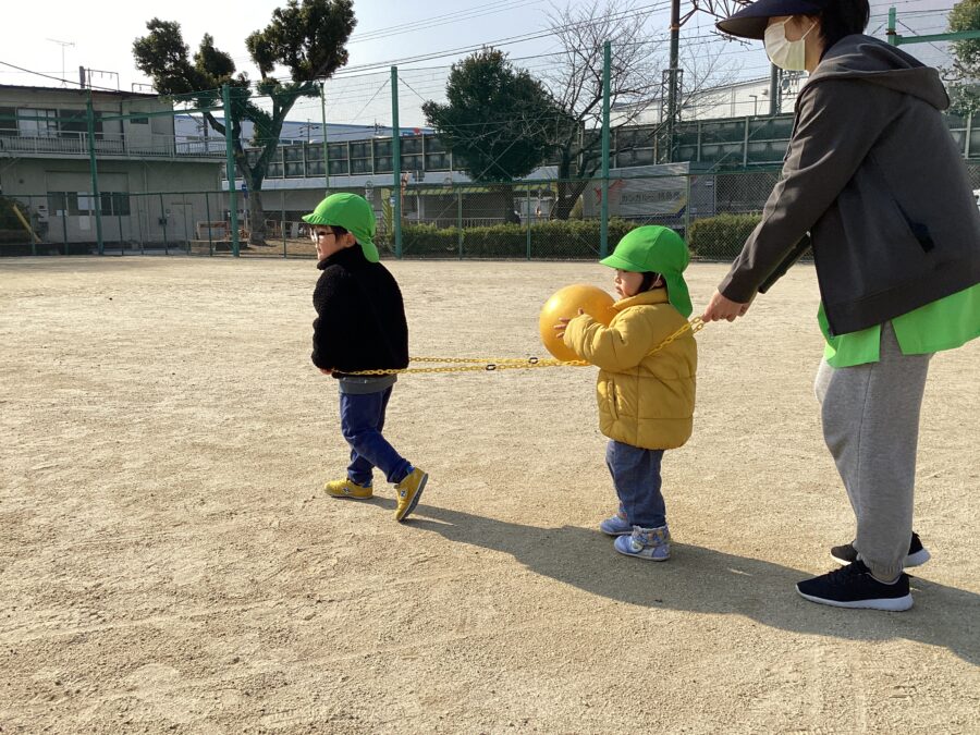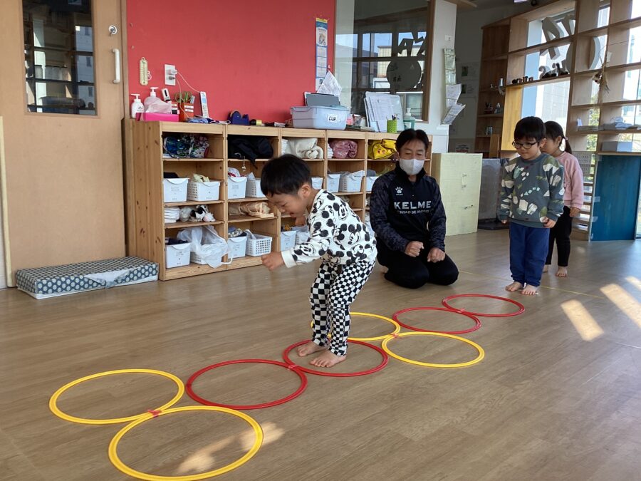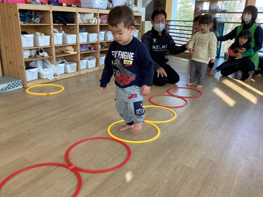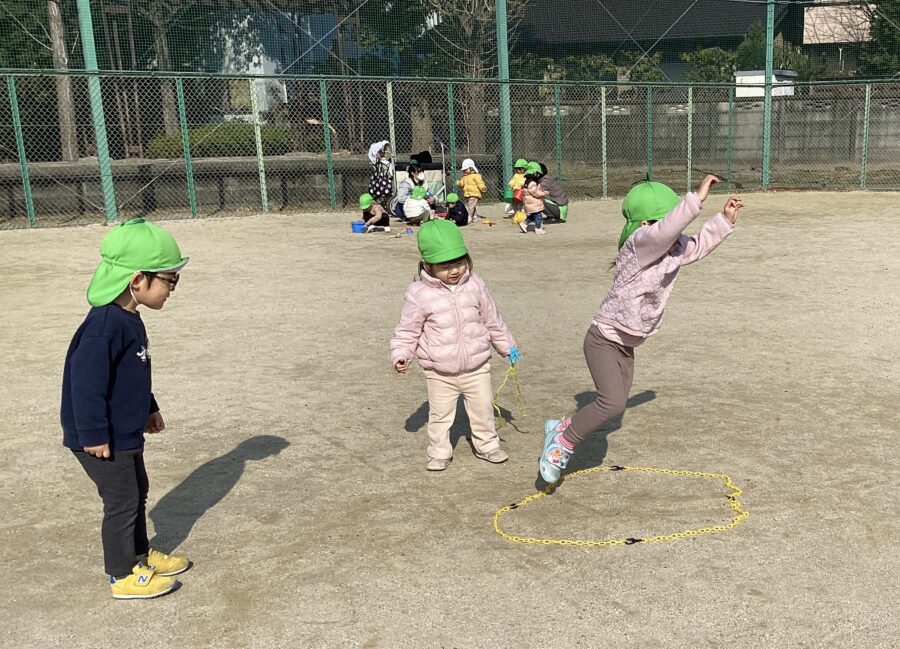 チェーンの輪をピョーーーーンと見事飛び越えていくひまわり組さん👏この後も自分でチェーンを調整しながら輪の大きさを変え、繰り返し楽しんでいましたよ。