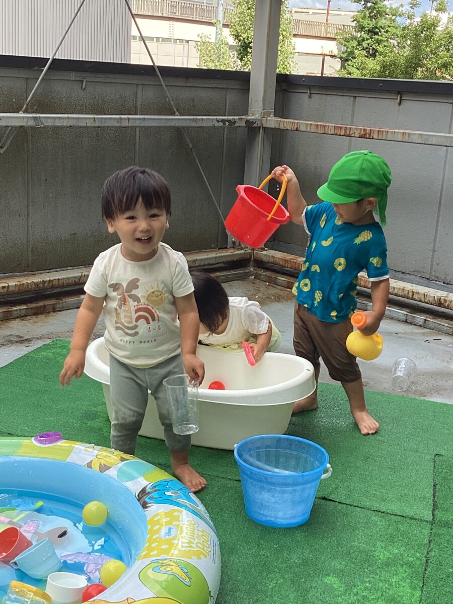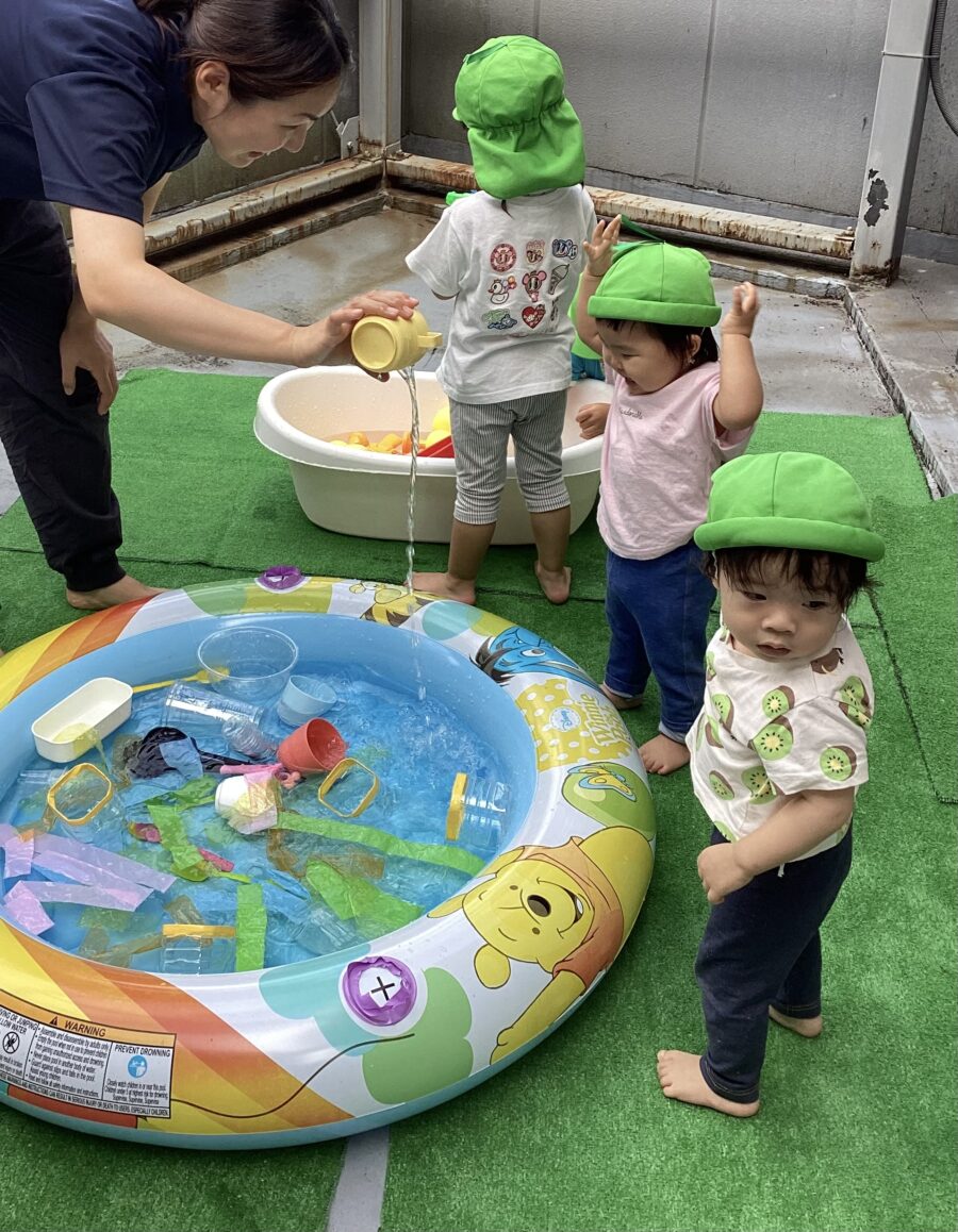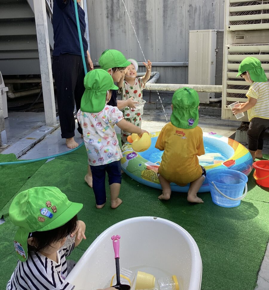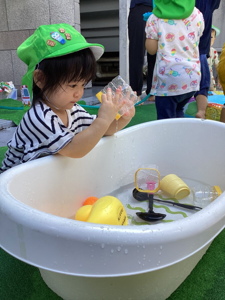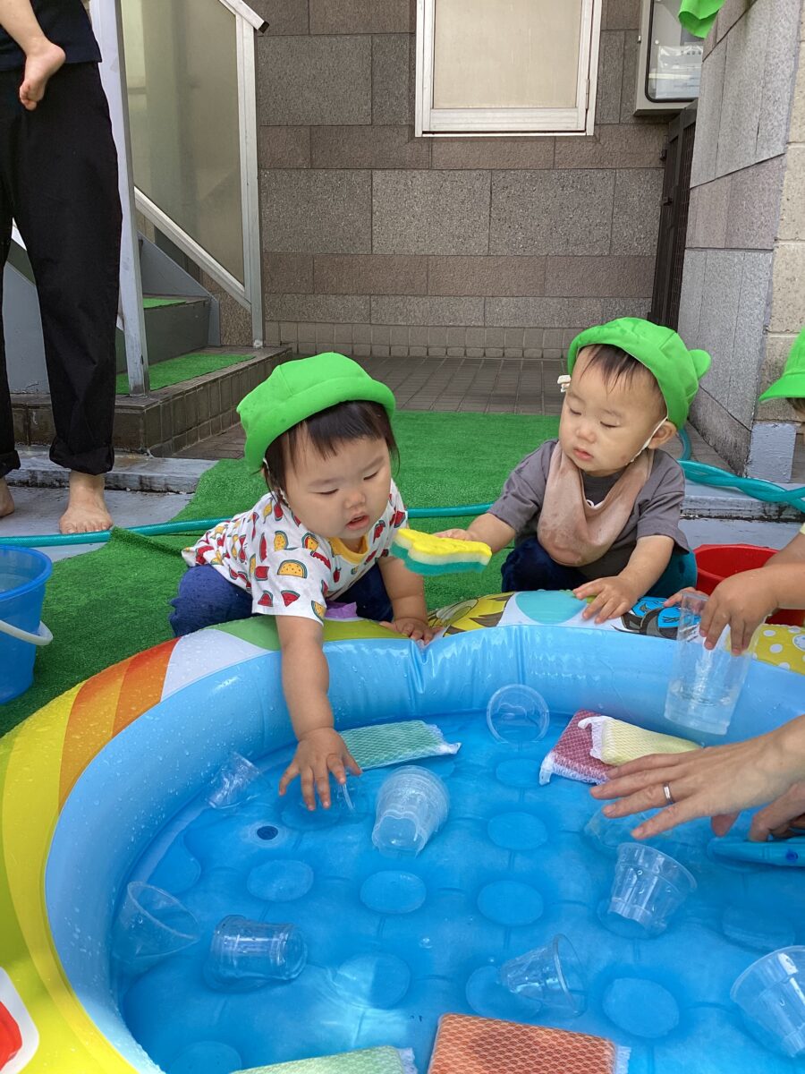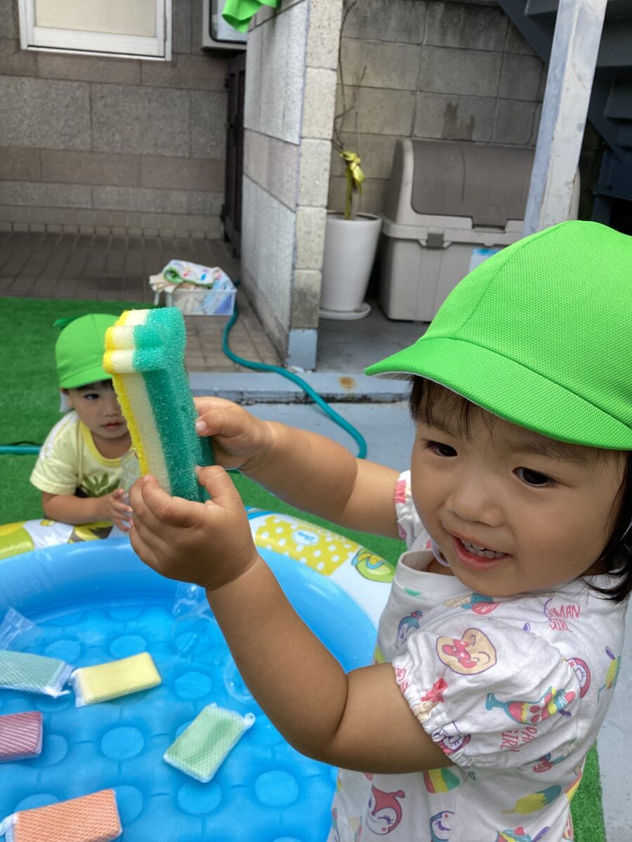 水遊びではキリンさん🦒のスポンジを見つけると「せんせい、みて〜!」と嬉しそうに教えてくれました✨