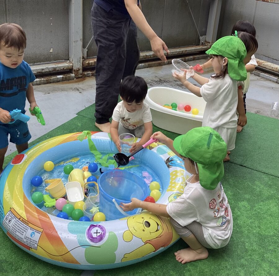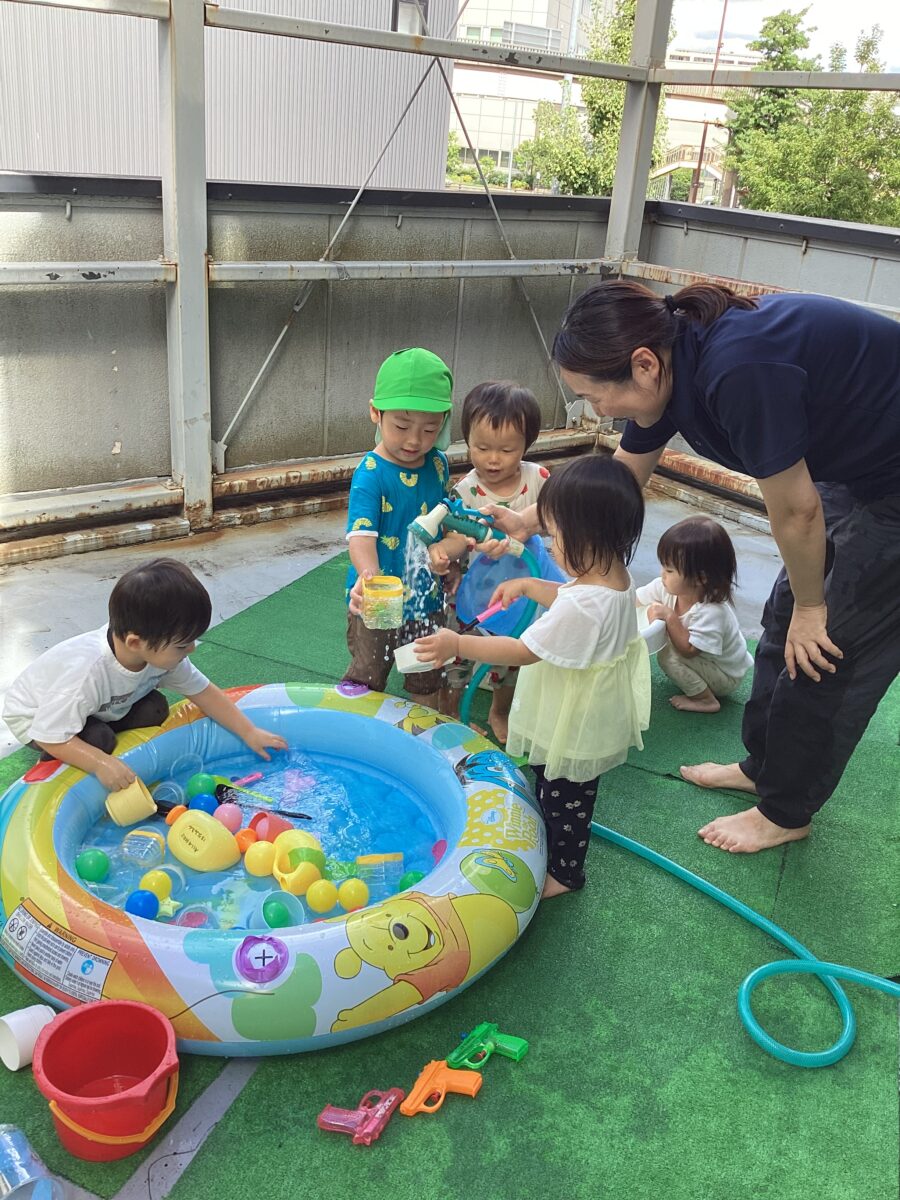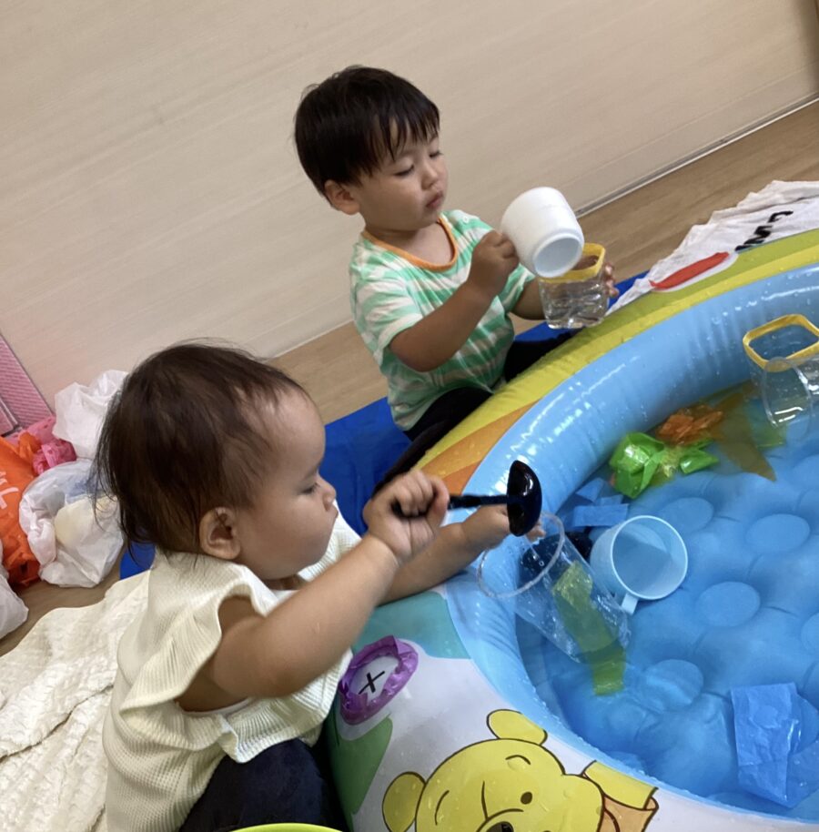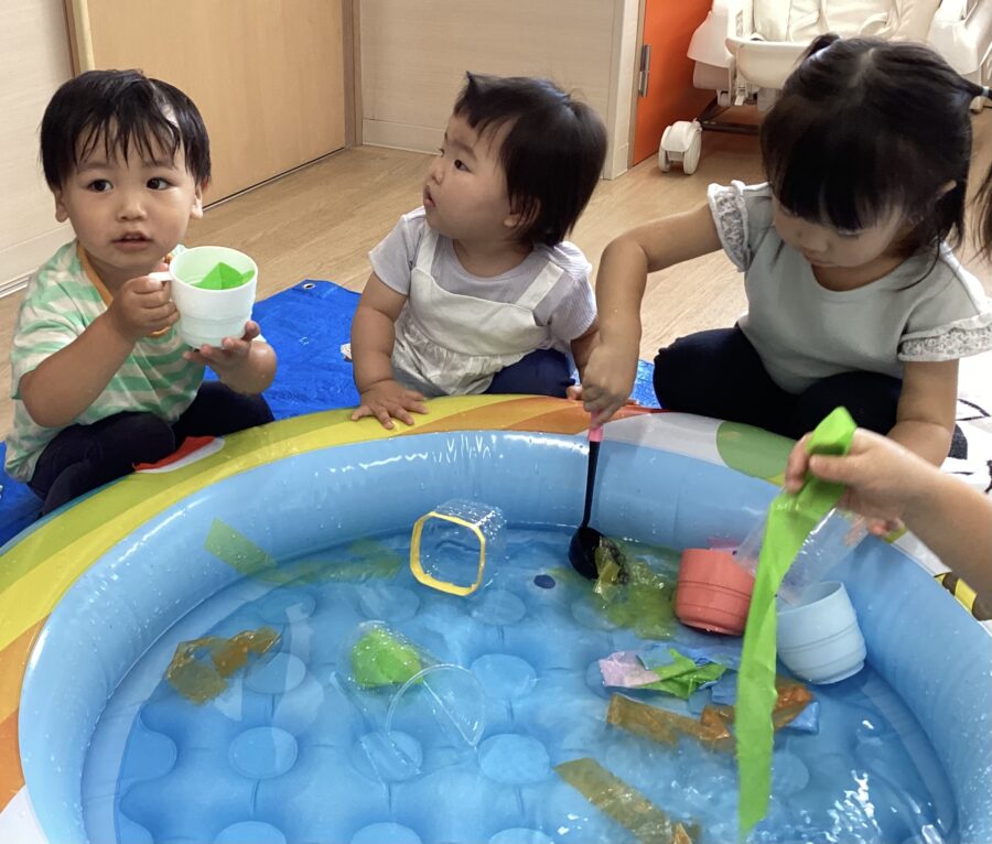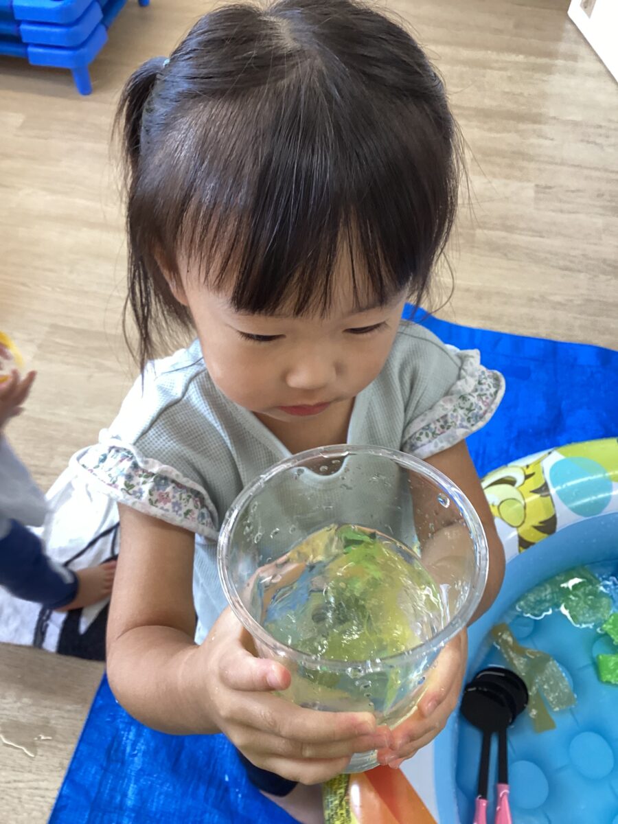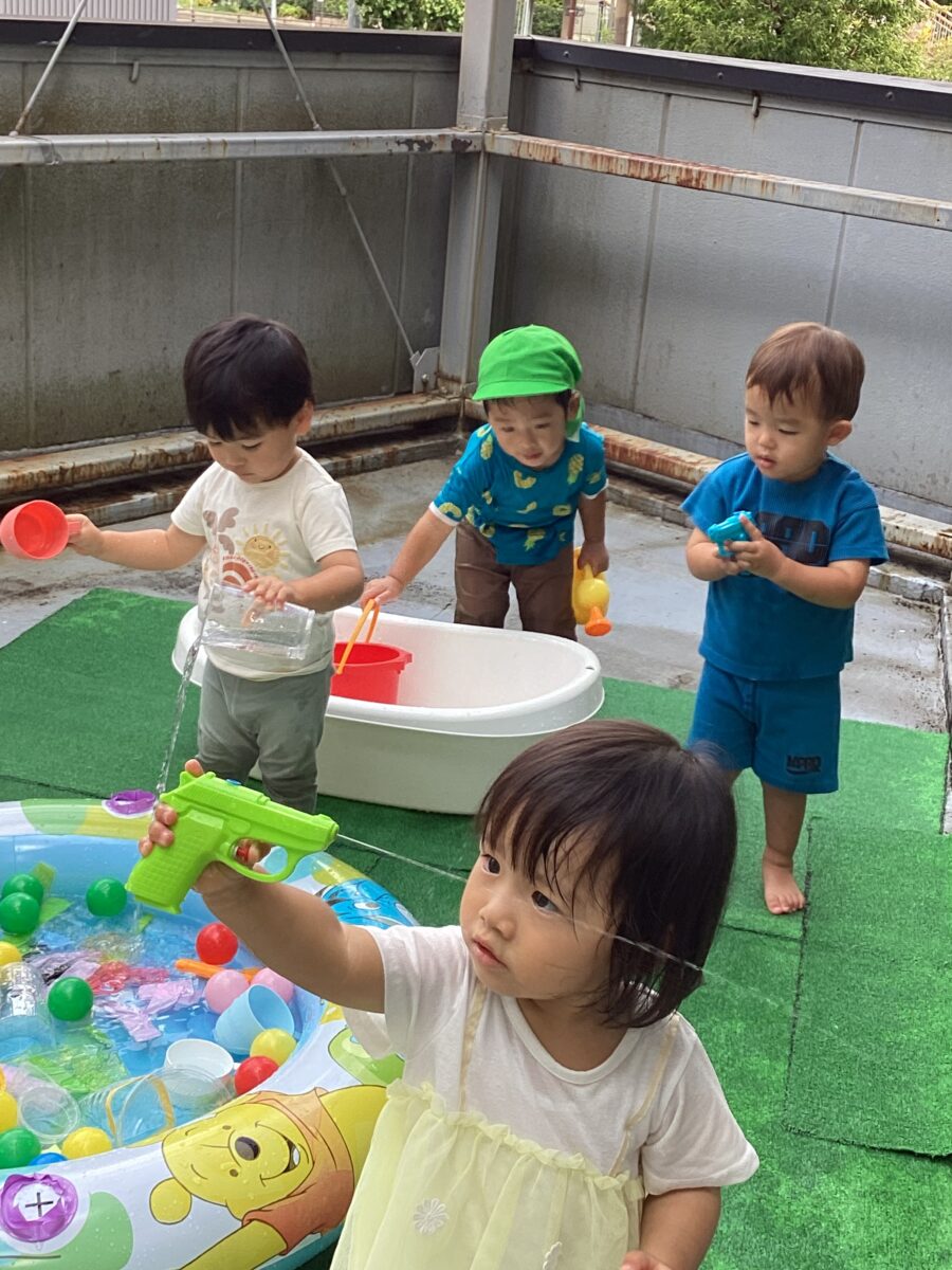 水遊びではキリンさん🦒のスポンジを見つけると「せんせい、みて〜!」と嬉しそうに教えてくれました✨