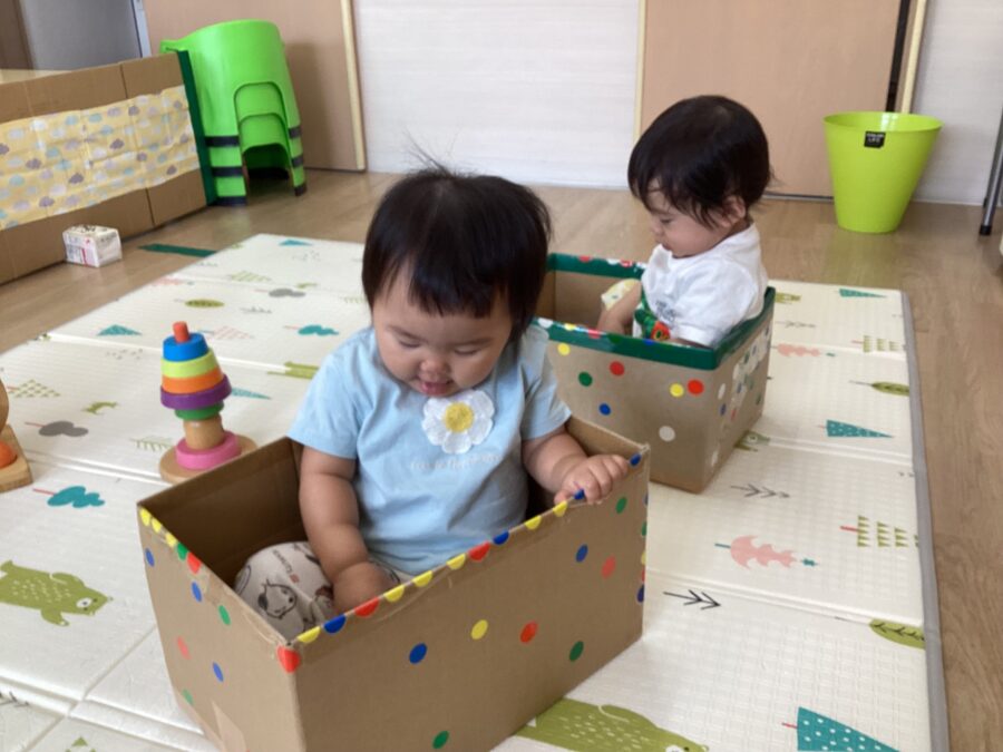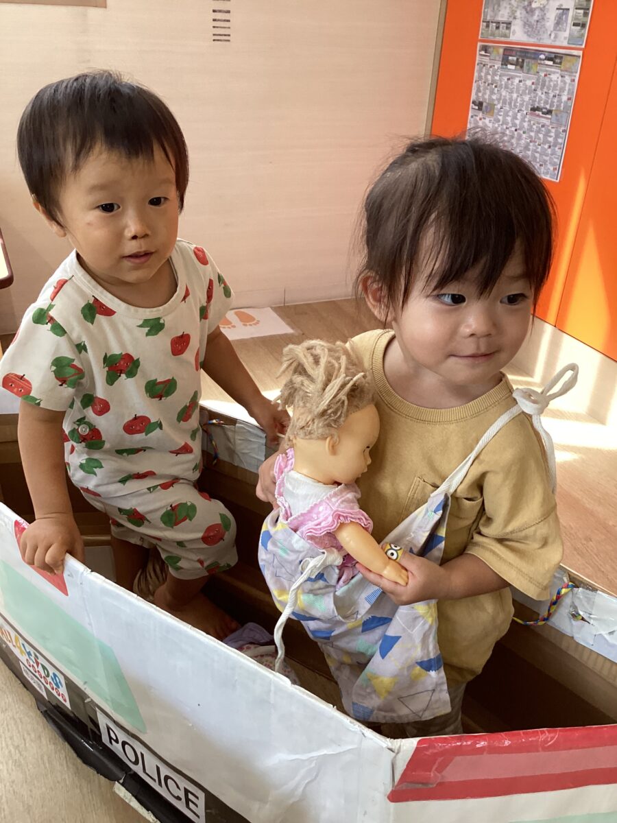 仲良く段ボールの乗り物に乗ってお出掛け🚃