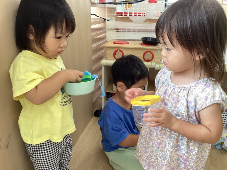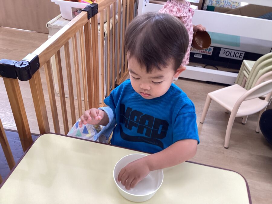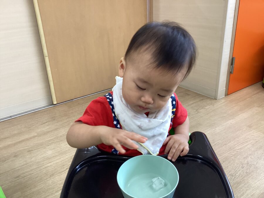 氷を見つけると手で掴もうとしたり、レンゲやお玉で氷すくいをして楽しんでいましたよ。