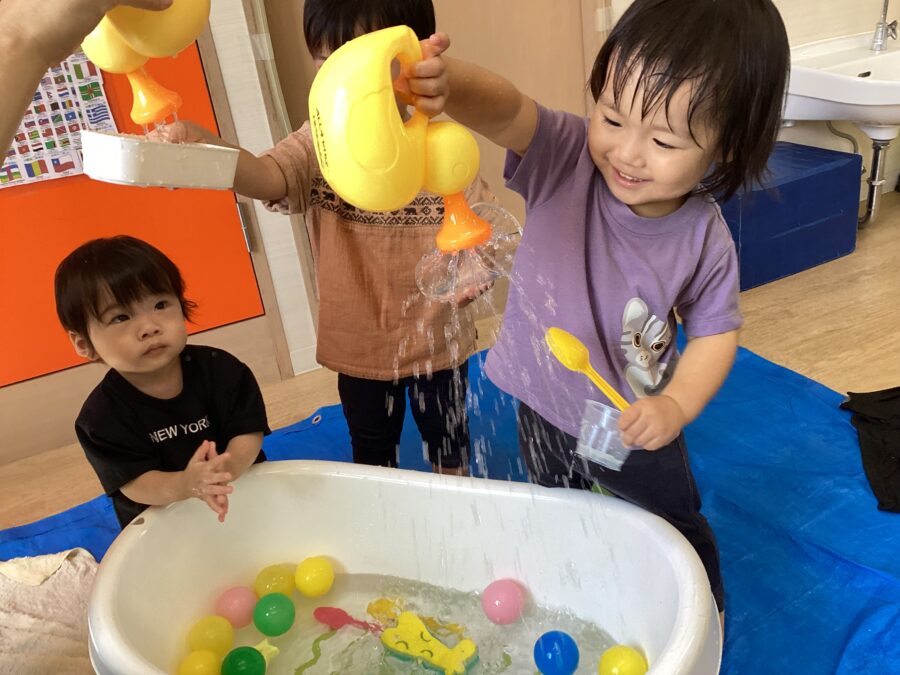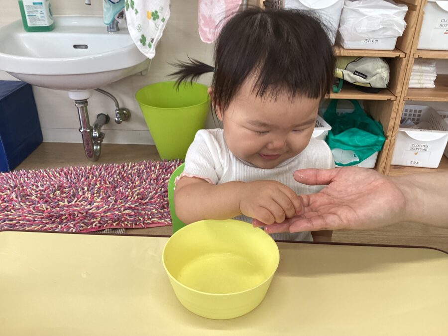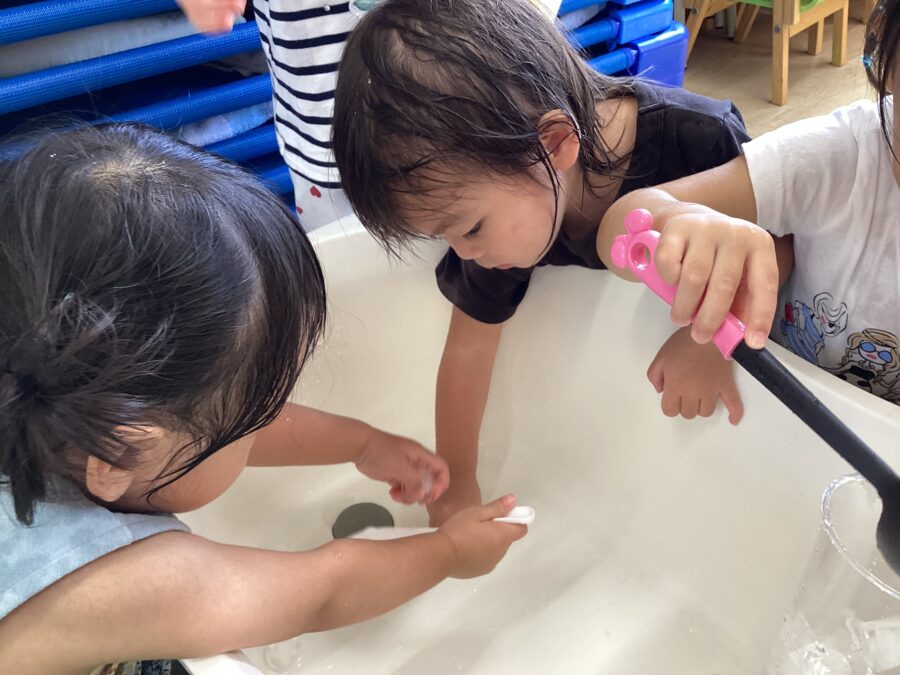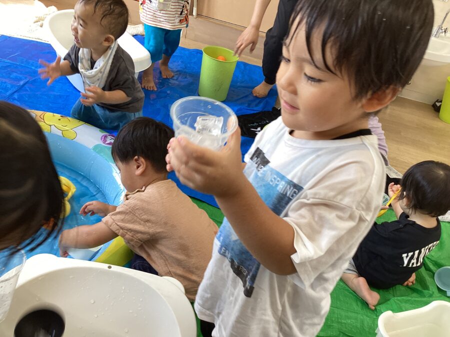 「きゃ~冷たいっ」と思わず笑顔でお友だちや保育者に教えてくれました!