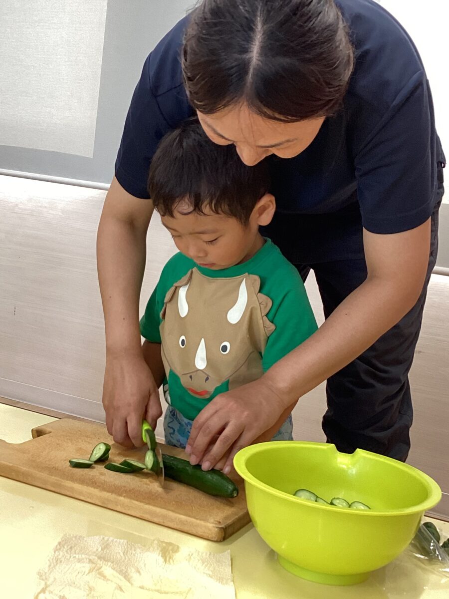 「お家でママとするよ〜✨」と言いながら、張り切って包丁を握り、きゅうりをトントン!!