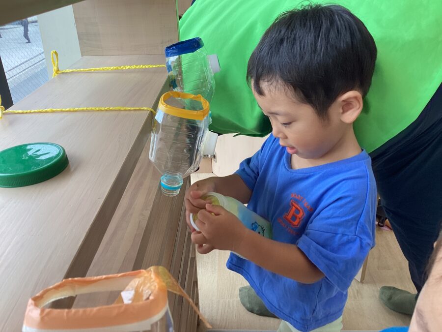 ペットボトルのコップにピンクや水色、オレンジなどのビニールの帯をたくさん入れてゴクゴク美味しそうに飲んでいましたよ
