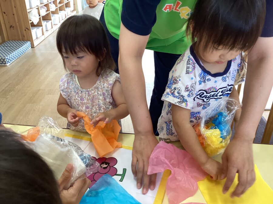 好きな色のお花紙を選んで、ビニール袋に入れます。