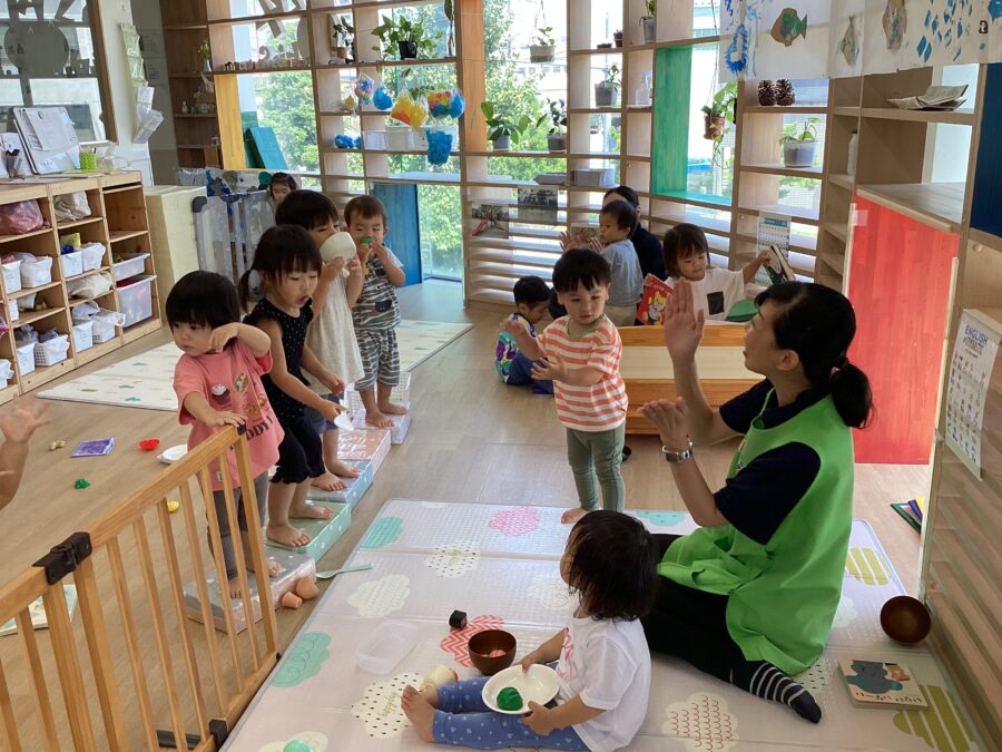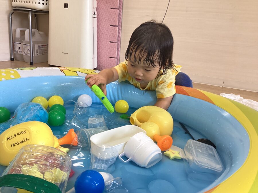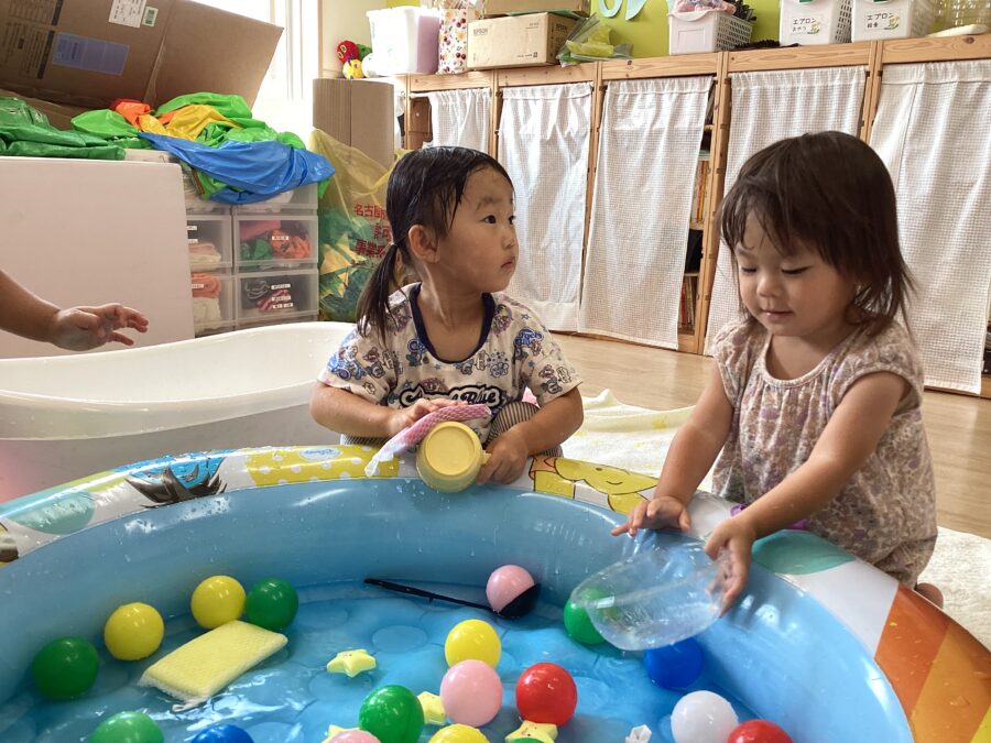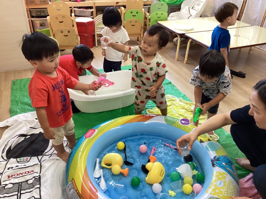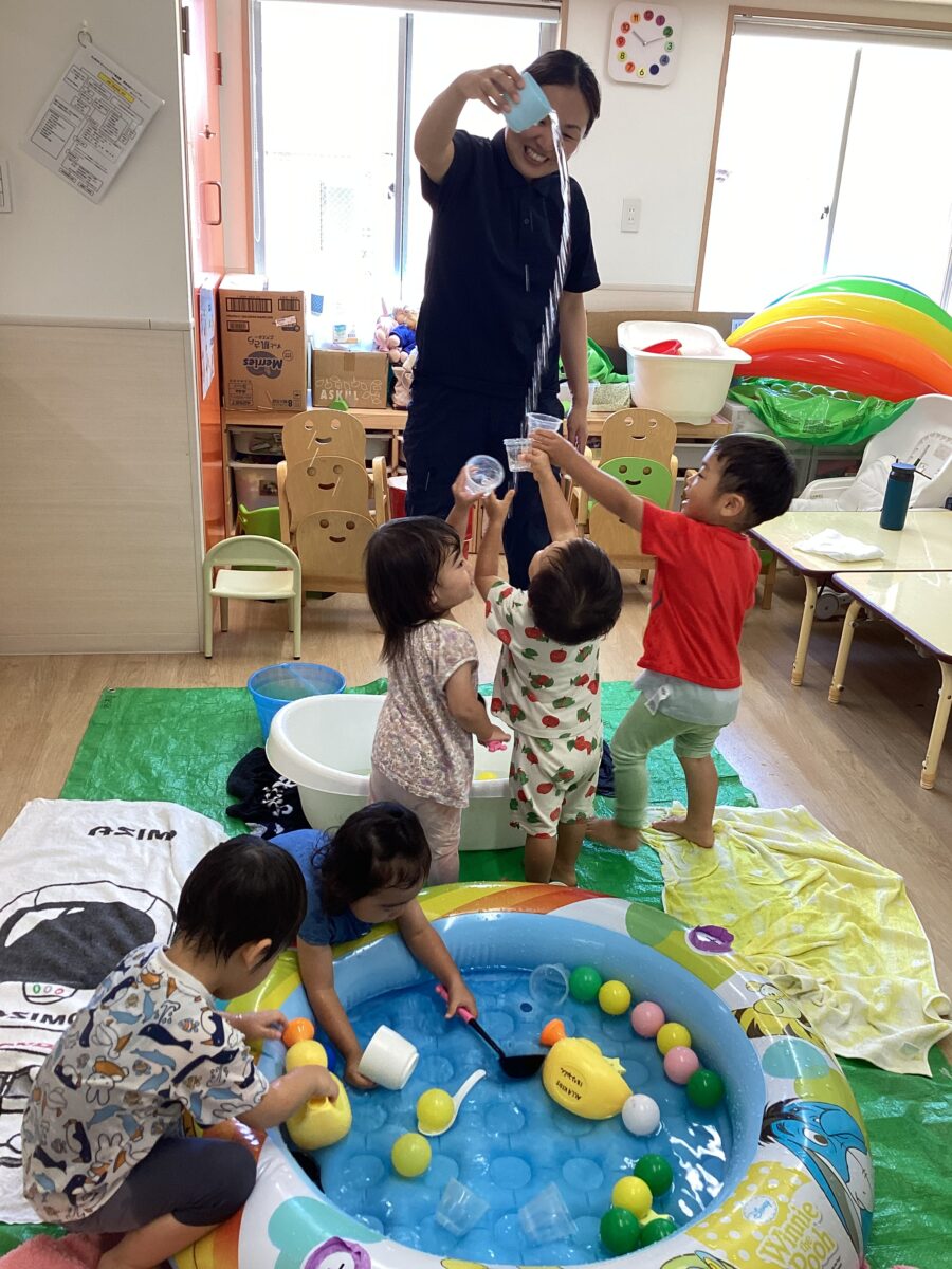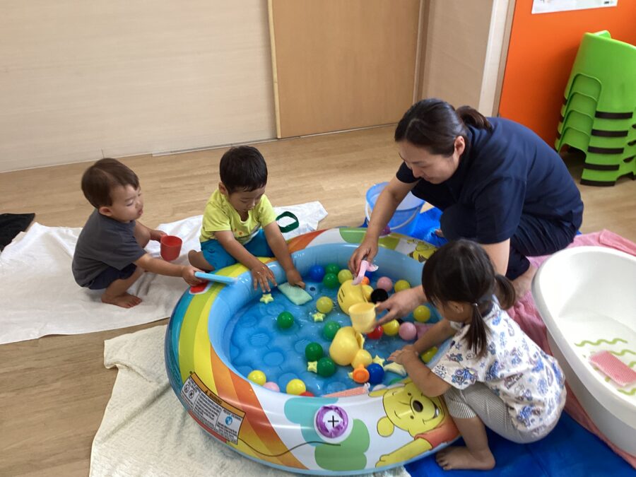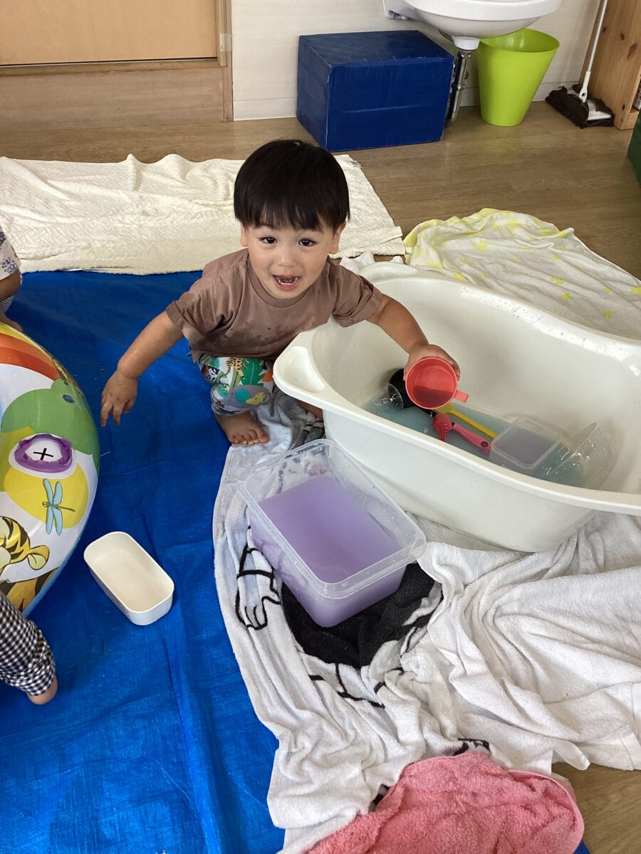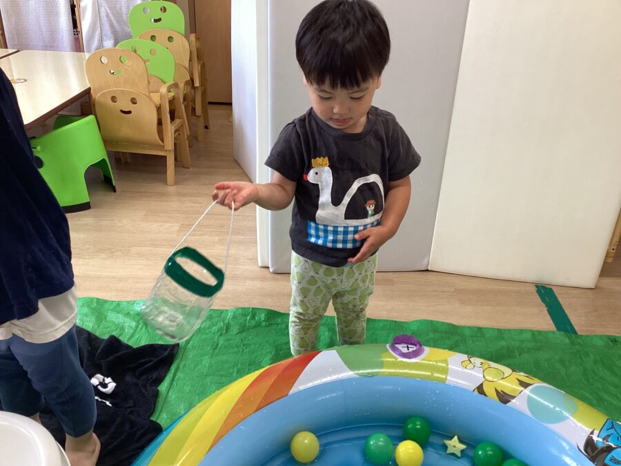 カップにカラーボールをのせてアイス屋さんをしたり、おばけに水をかけたりして今日も元気いっぱい遊びました✨