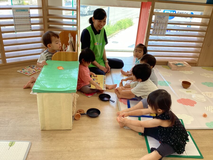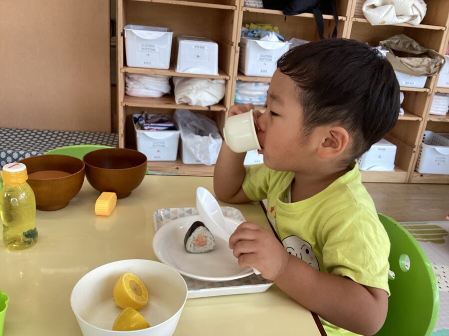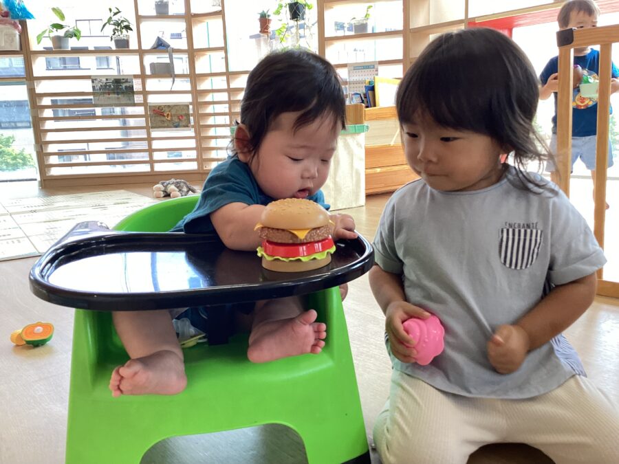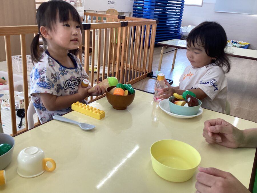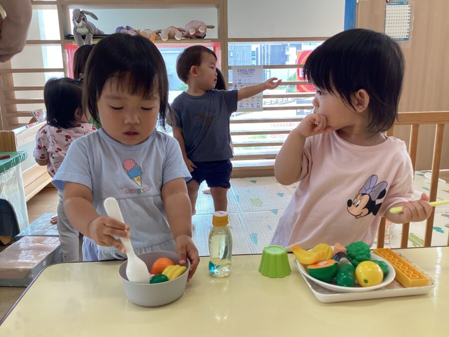 「できあがり~、食べていいよ」とキッチンに戻って色んな食べ物を次々と運んでくれたりする姿があり、保育者や友だちとの関わりを楽しんでいました