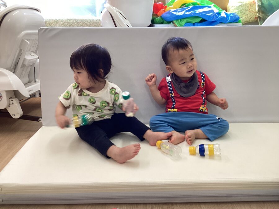 マットの上で仲良く並んで遊ぶ姿、癒されますね☺️