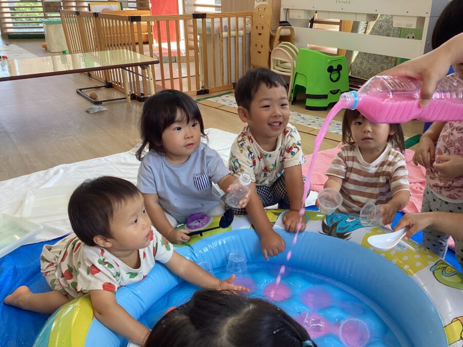 ちゅうりっぷ組とひまわり組のお友だちは色水遊びをしました。