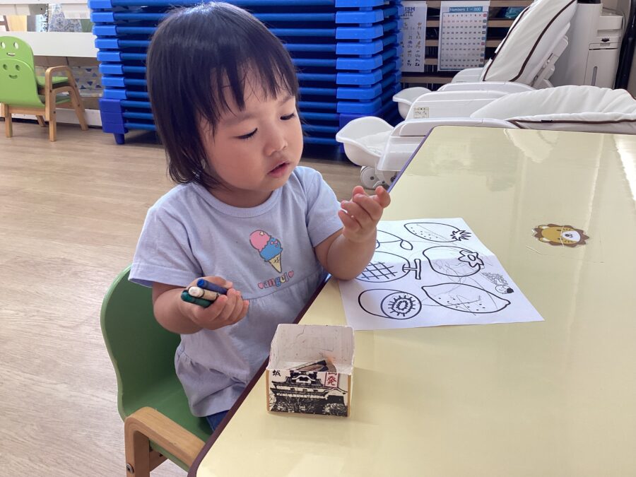 今日は色水でも遊びました。カップにテッシュを詰めて、上から色水をかけるとかき氷の出来上がり🍧