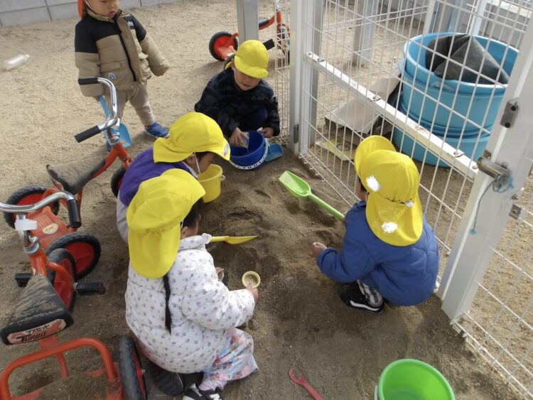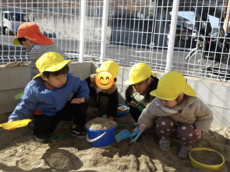 砂場からバケツで砂を運んだり、スコップで均して整備したり、まるで本当の工事現場のようでした、、、!![]()