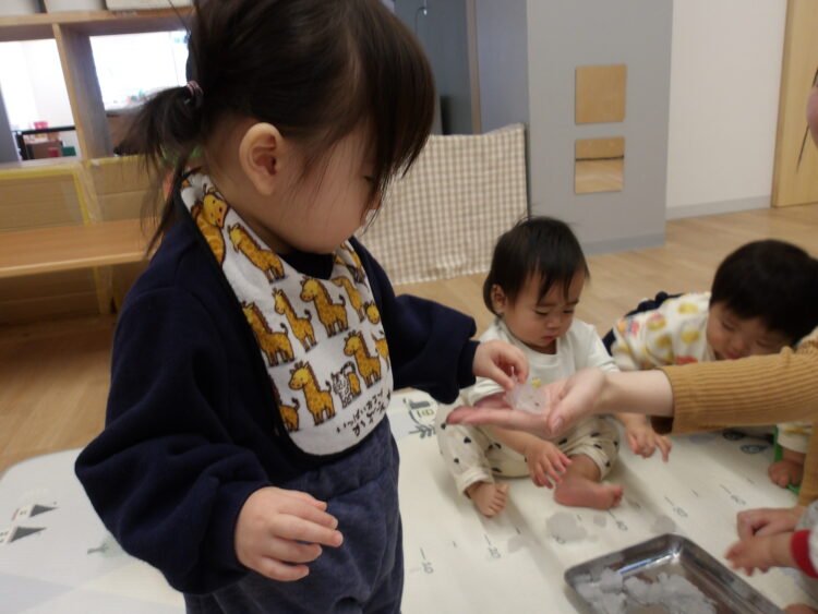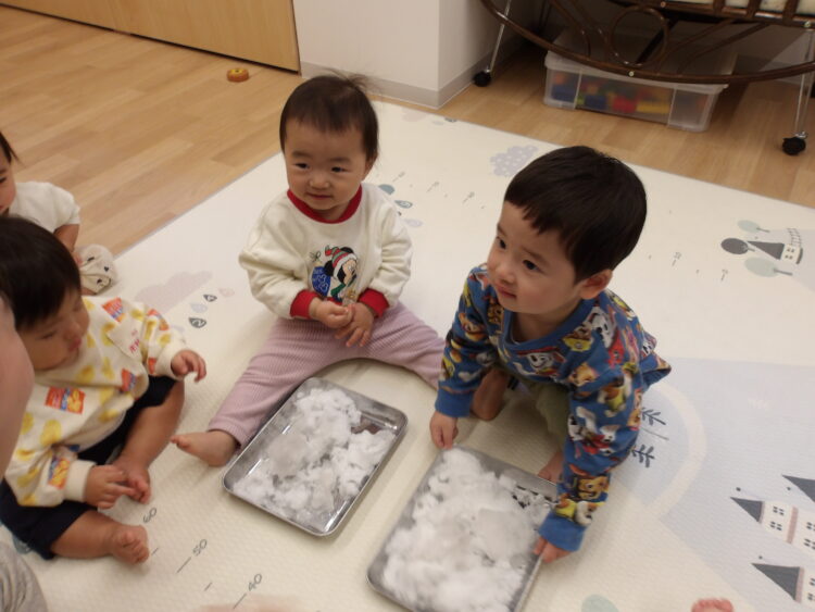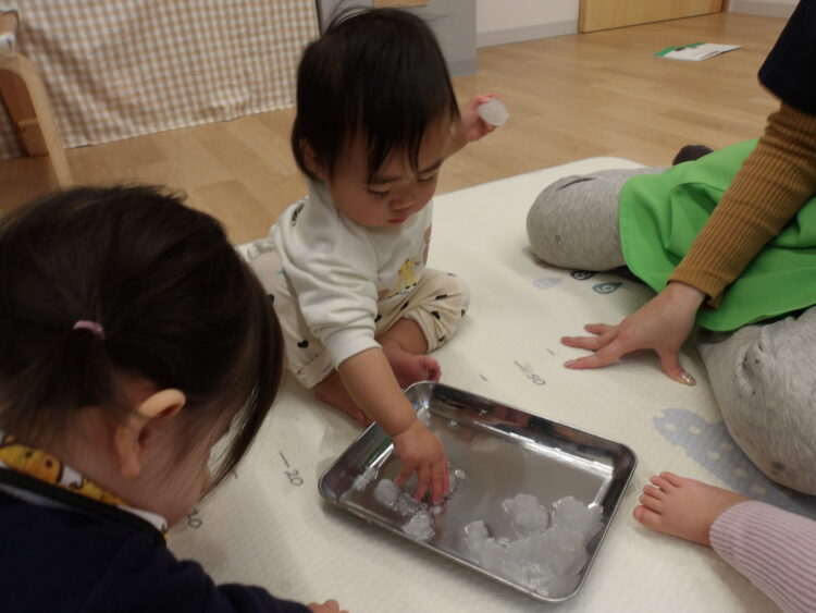 今日のひよこ組さんは昨晩に降った雪をお部屋で触って遊びました