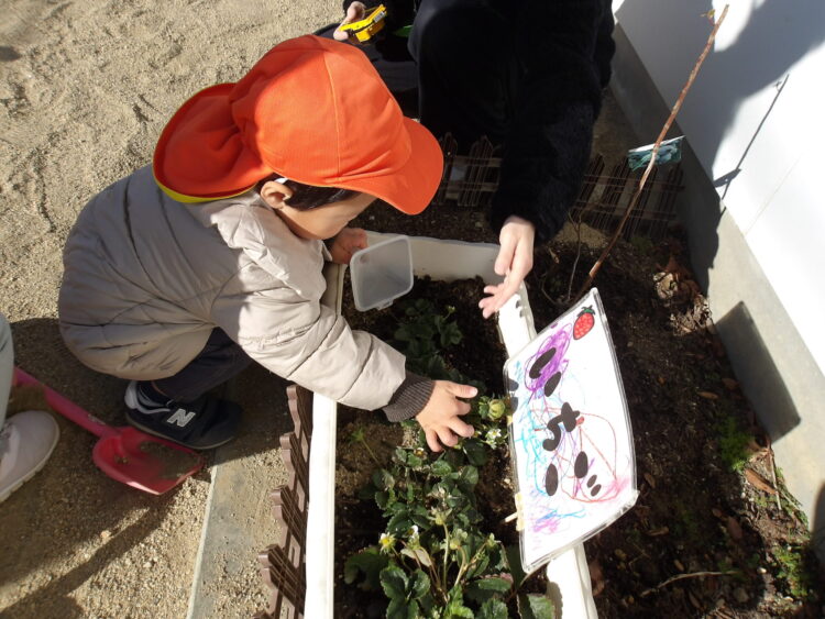 花壇のいちごの実が大きくなってきました