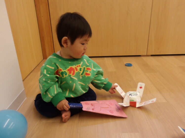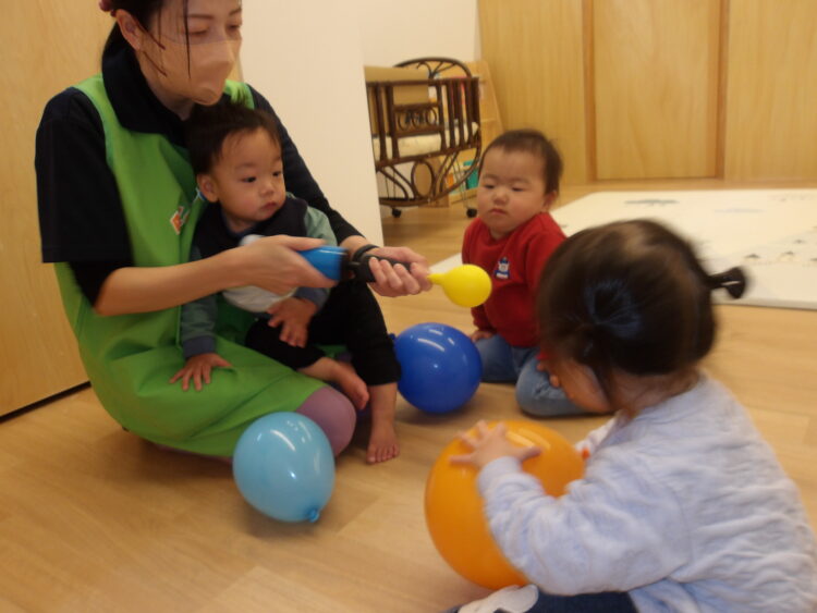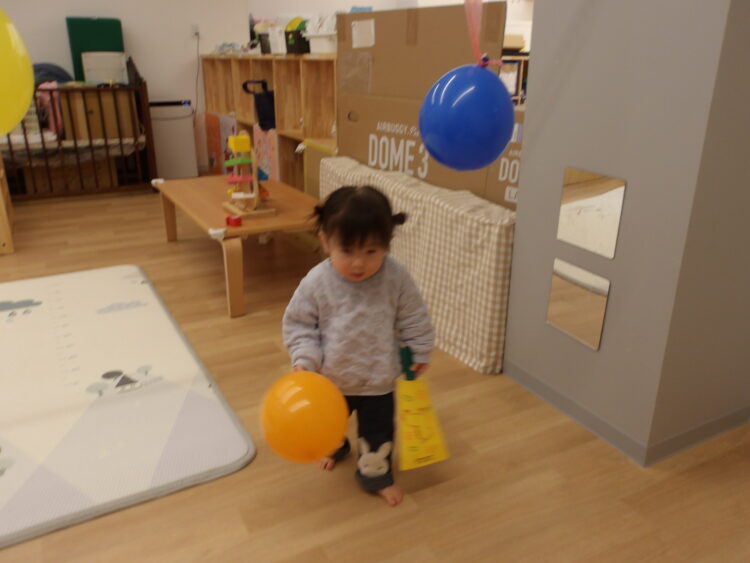 今日はお部屋で風船羽付きやこま回しをして遊びました。保育士が風船を膨らまし始めると興味津々に集まってきた子どもたちです😊