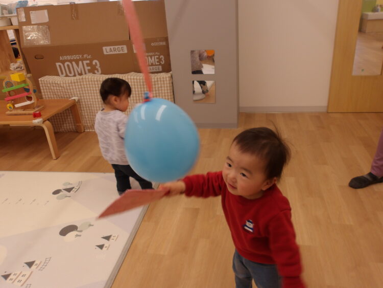 上から吊るした風船を羽子板でポーンとついてみることにチャレンジ!上手く当たると嬉しくて何度も繰り返し楽しむ子もいました‼️