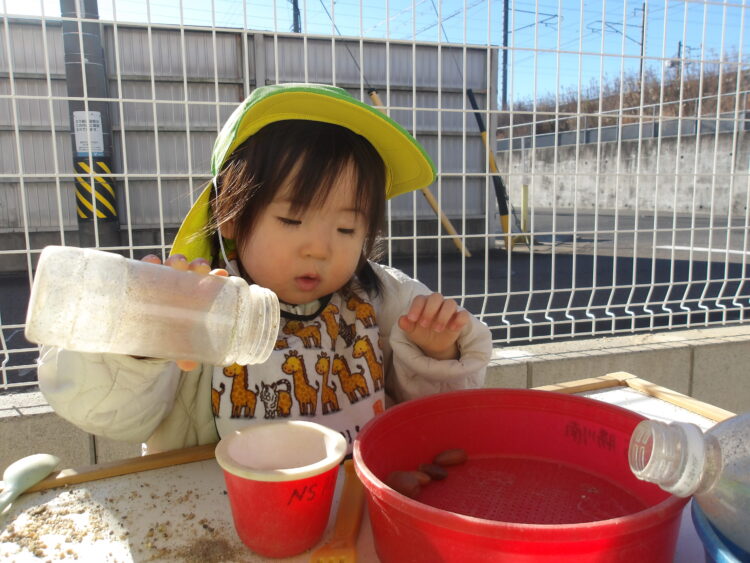 どんぐりをカップに入れて、カップから容器へと移して遊んでいましたよ![]()