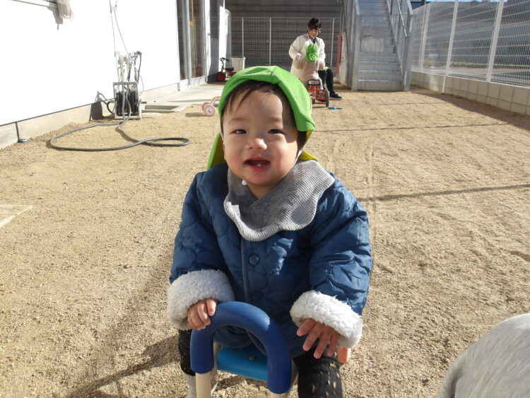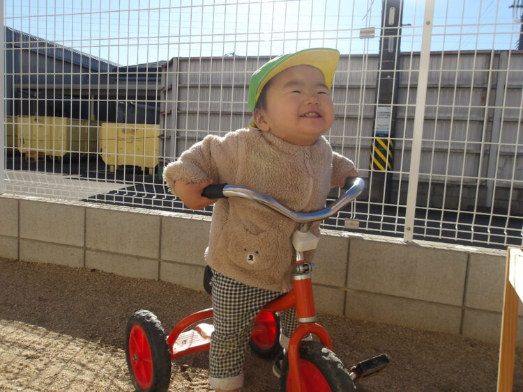 三輪車に乗り、保育士と目が合うと「い〜!」とニッコリ笑顔を見せてくれました![]()