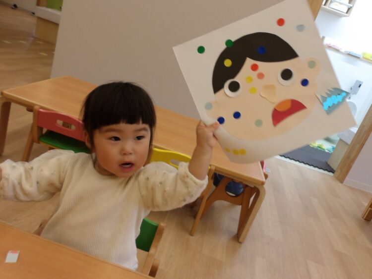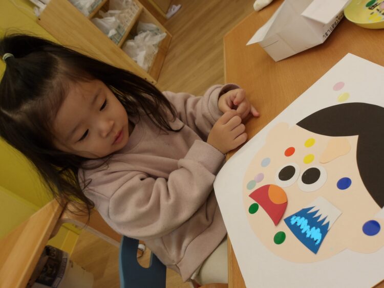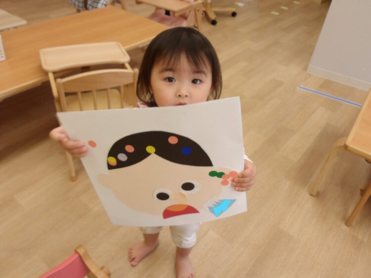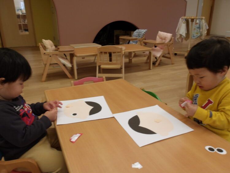 顔の台紙に目や鼻、口のパーツを貼って福笑いをしました。