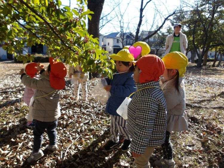 みんな赤い木の実をお散歩バッグに入れて、集めています❗️