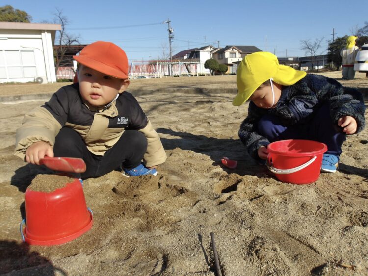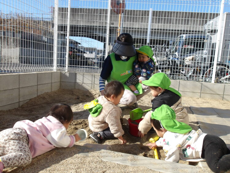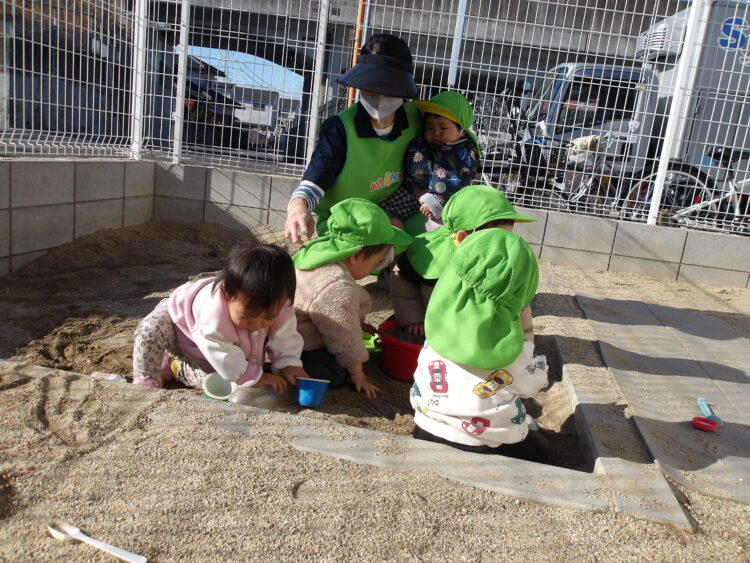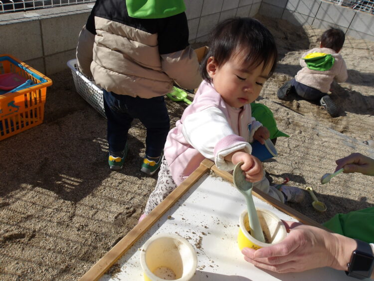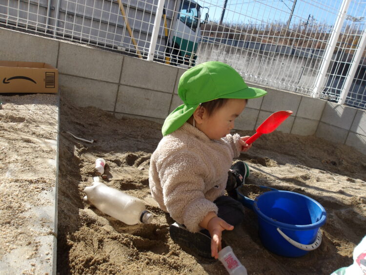 みんなお砂遊びが興味津々で大好きなひよこ組さんです🐥