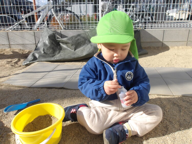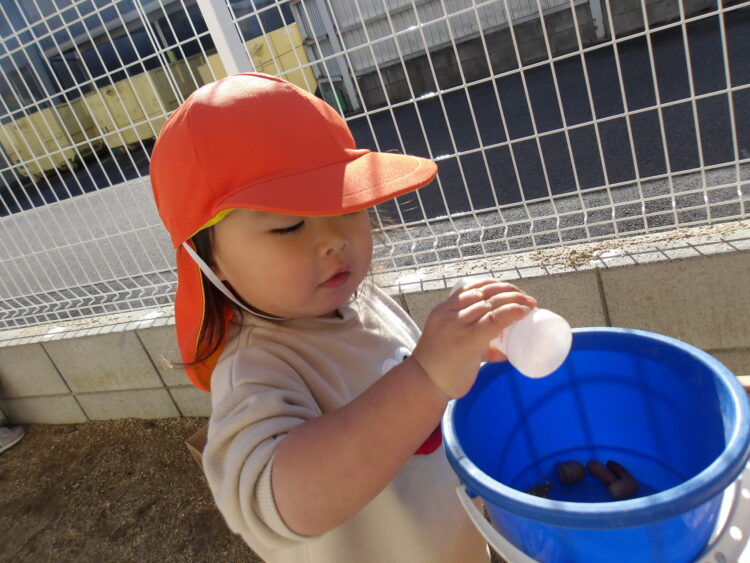 どんぐりを容器の中に真剣に入れて遊んでいました![]()