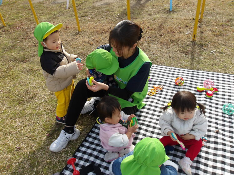 レジャーシートの上で好きなおもちゃをそれぞれ見つけて楽しみました![]()