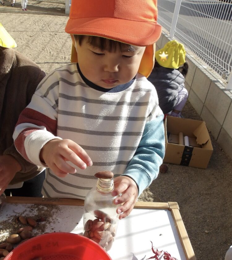 あひる組さんも飲み物の容器の小さな口に、真剣にどんぐりを入れています。