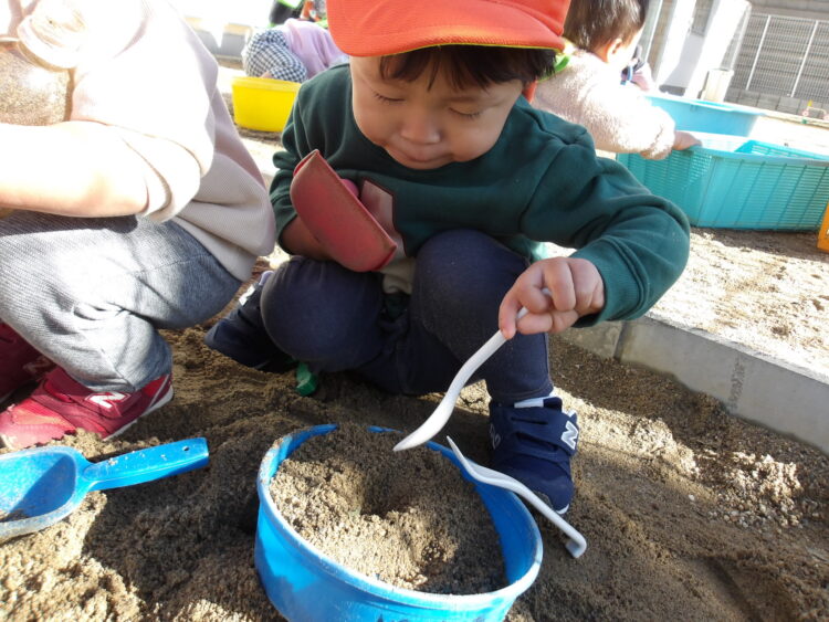 最近、砂場でおままごとが盛んなので、スプーンとフォークを用意してみました!さっそく、お料理が始まったり、食べる真似をして楽しんでいました🥰