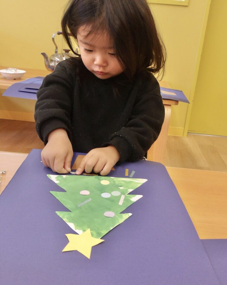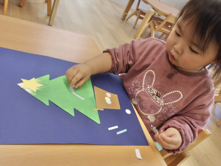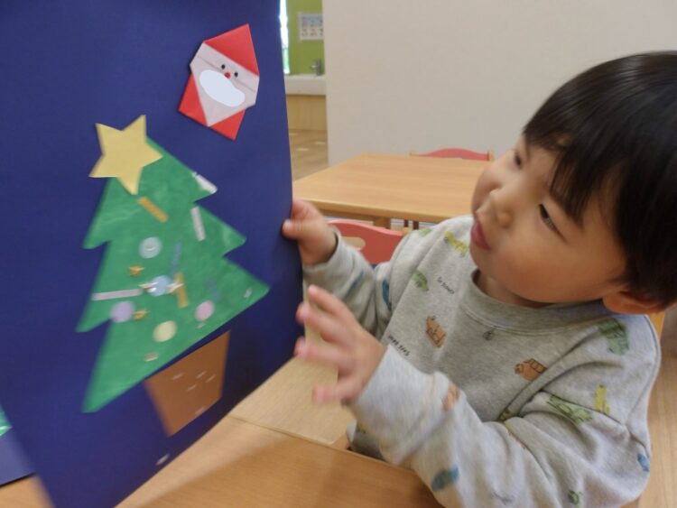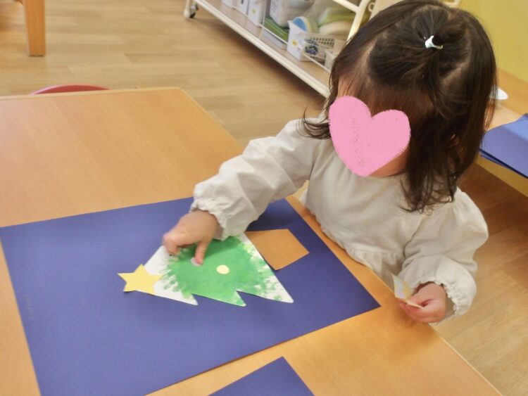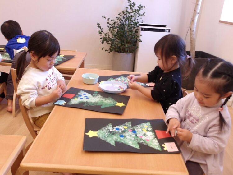 うさぎ組さんは、先日作ったツリーにシールを貼って、飾り付けをしました🌲