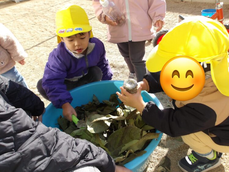 ひよこ組さんのお友だちは今日から登場した葉っぱ風呂に自分から寄って行っていました!