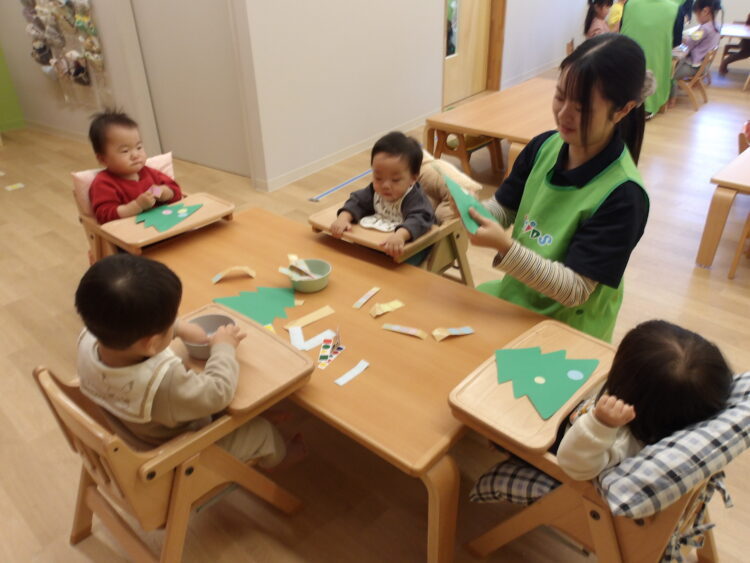 みんなで一緒にシールを使ったクリスマス飾りを作りました。