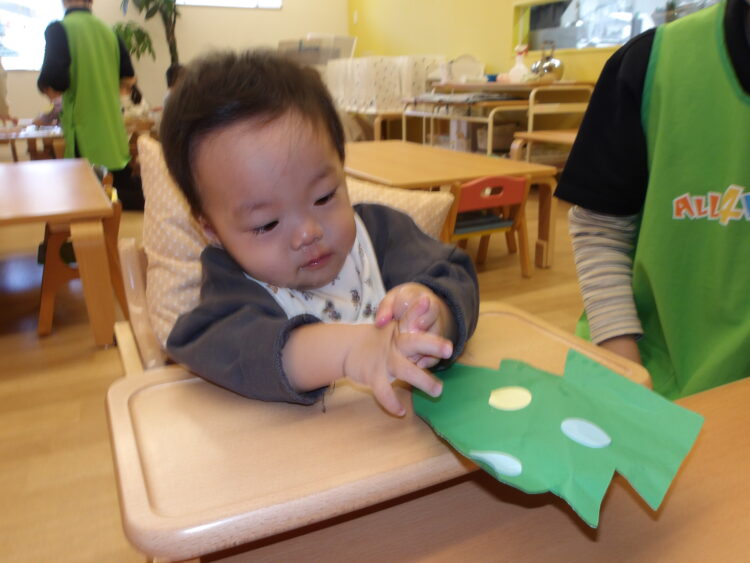 以前の製作で行ったのもあり、何度か貼り進めるにつれシールの仕組みが分かって、もっと〜!と手を伸ばす様子もありました![]()