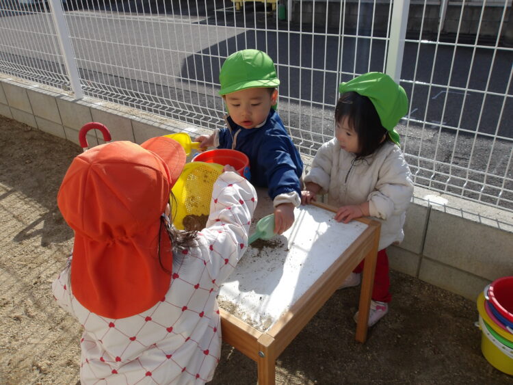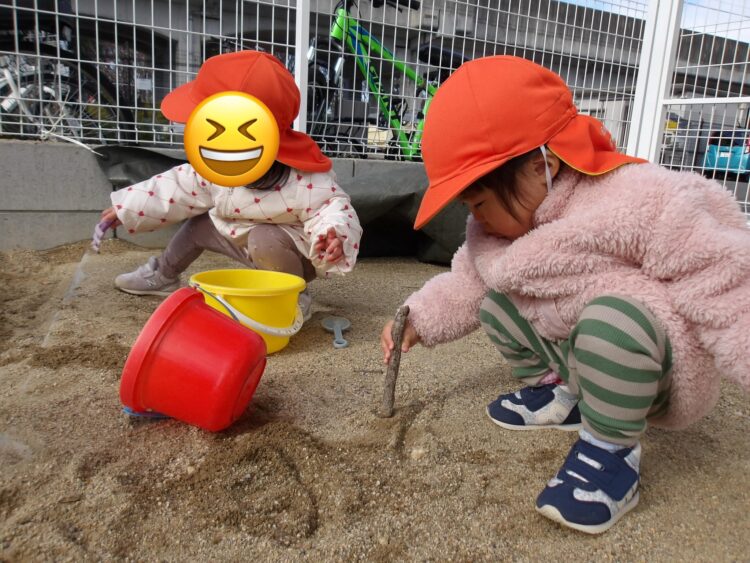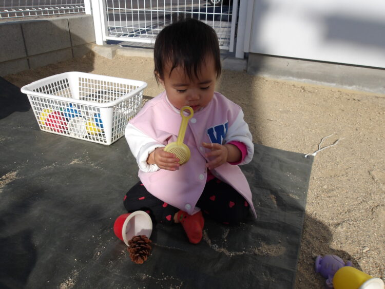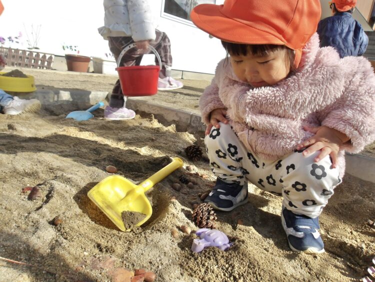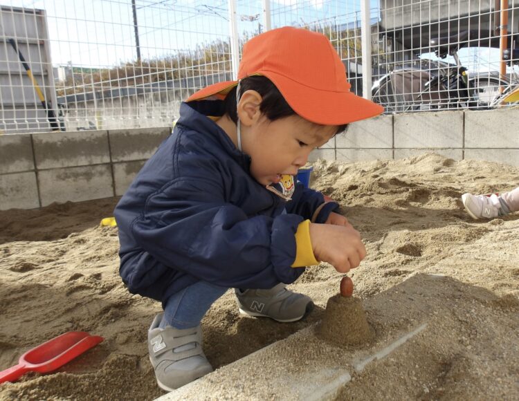 最近は保育士の真似をして、砂場で型を取る様子もみられるように![]()