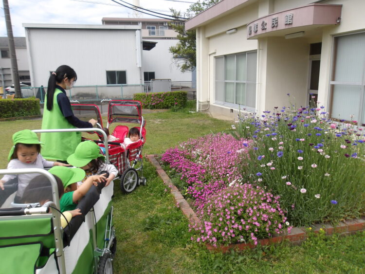 花壇のお花をみんなで見ました!保育士が色を英語で伝えると、真似をして「ピンク!」「ブルー!」と言っている子もいましたよ![]()
