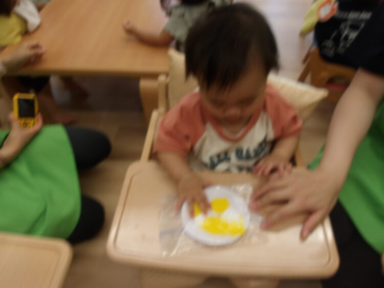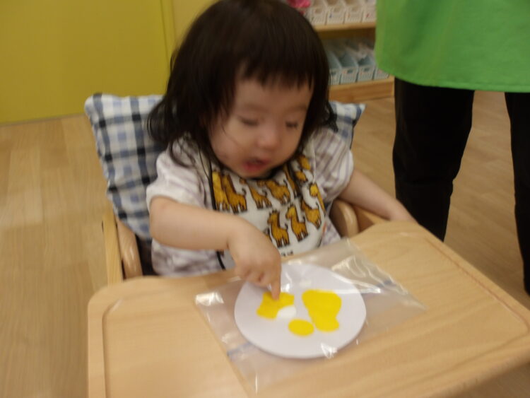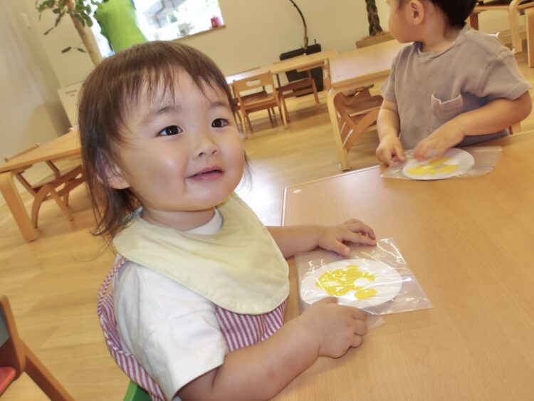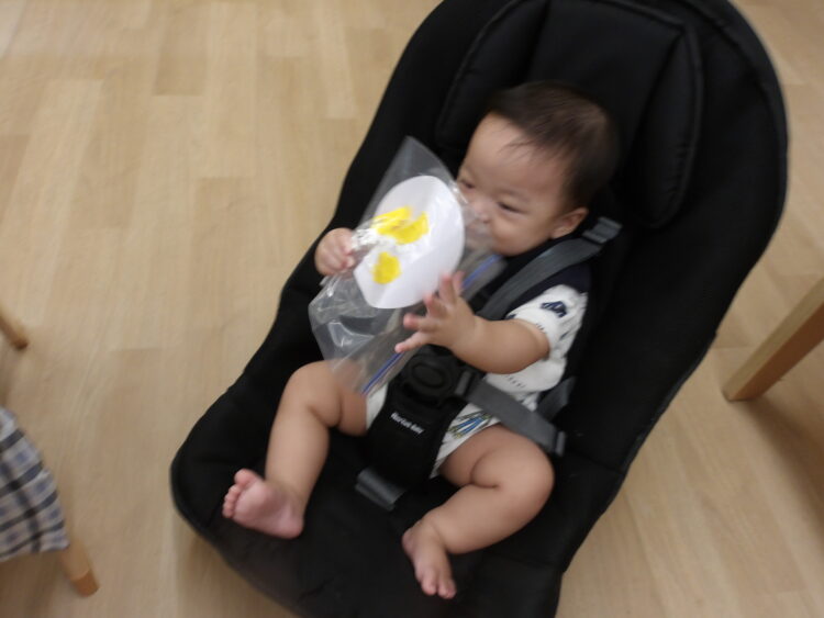 室内では、今日は絵の具を使った感触あそびを行いました。画用紙の上にのせた絵の具を袋の上から指で押してみたり、手のひらで触ってみたり紙をクシャクシャっと曲げてみたりいろいろ試しながら遊んてまいました![]()