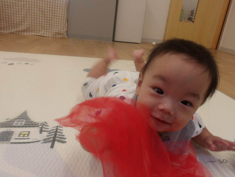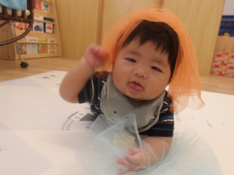 オーガンジー素材のスカーフを頭に乗せたり、ふわふわと動かしたりして楽しそうでした![]()
