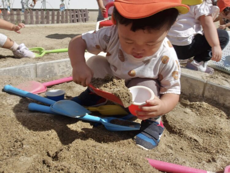 スコップを使って砂の感触に興味津々![]()