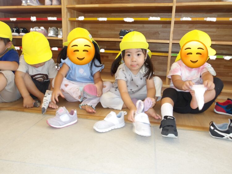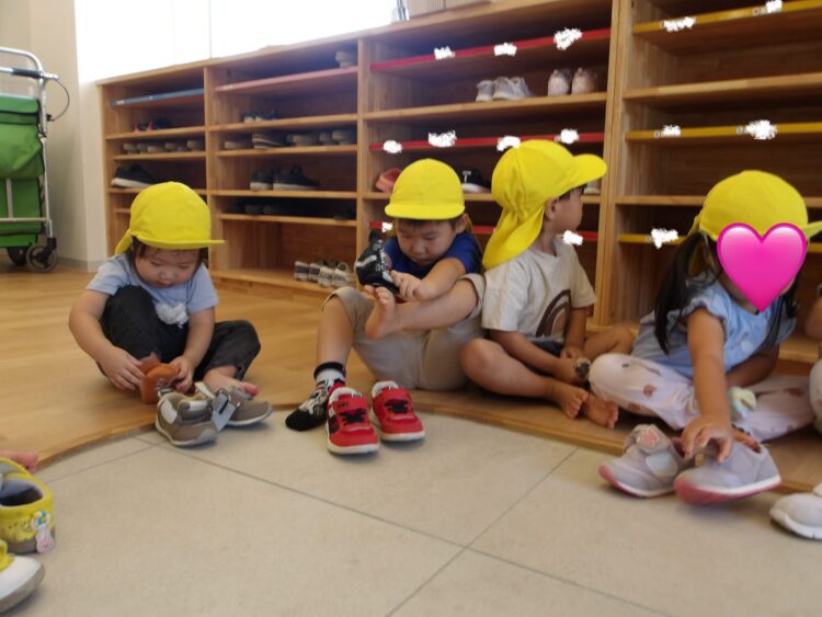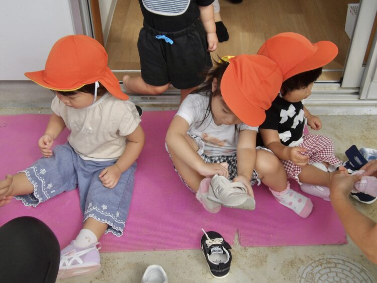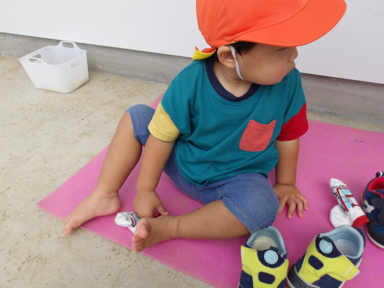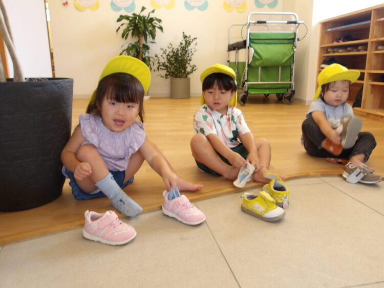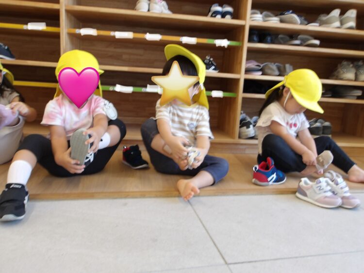 今日は戸外遊び😊うさぎ組のみんなは自分で靴下と靴を履いています🎵