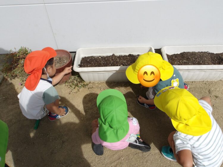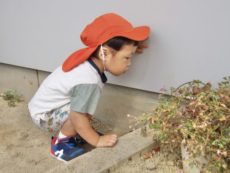 園庭に出るの虫が好きなお友だちは虫探し❗️蟻がプランターの隙間にいて、お友だちと蟻観察に夢中です🐜