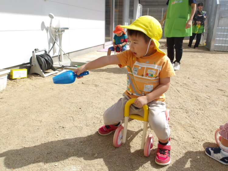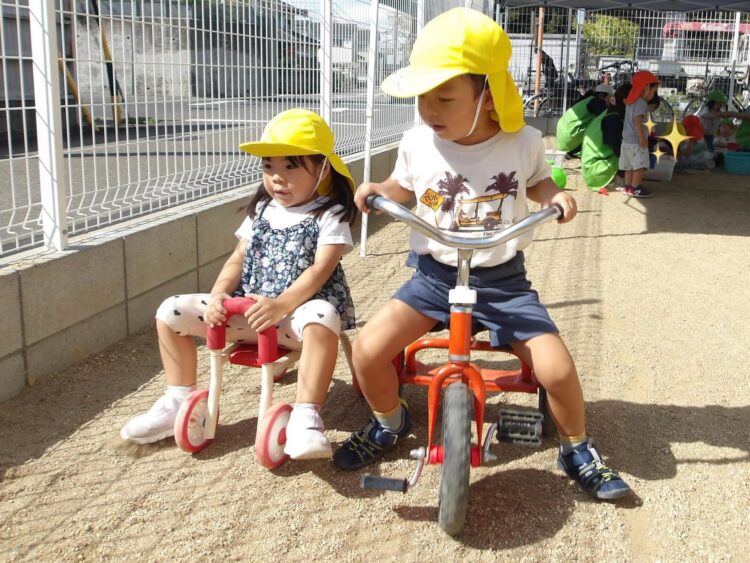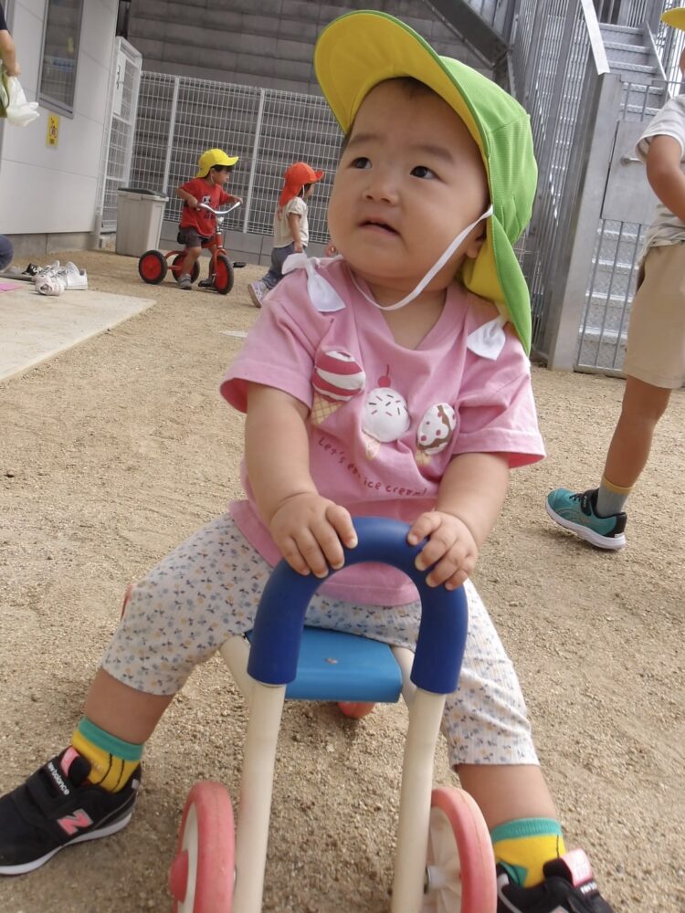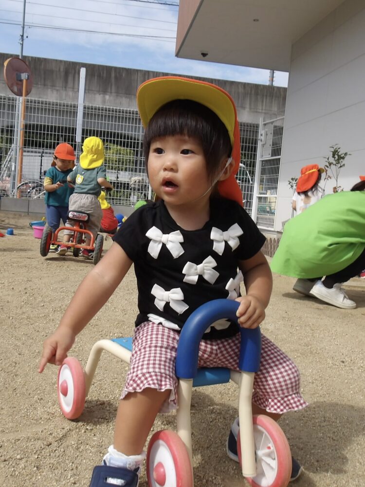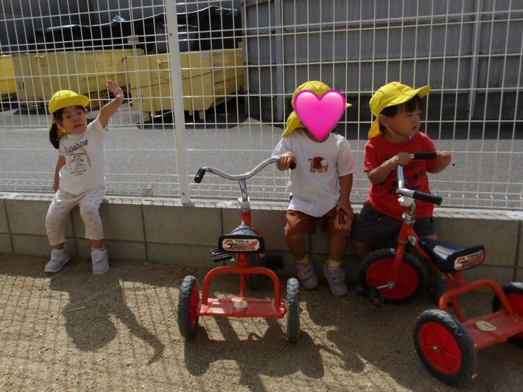 三輪車、四輪車も大人気で、いつもお友だちと交代で仲良く並んで園庭内を散歩して楽しんでいます🎵