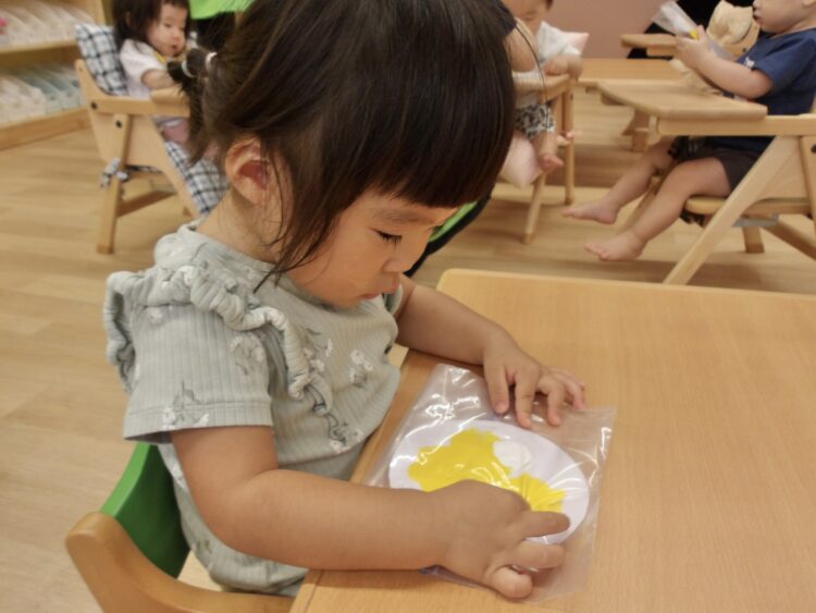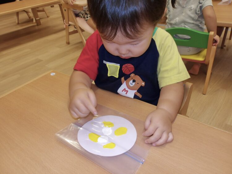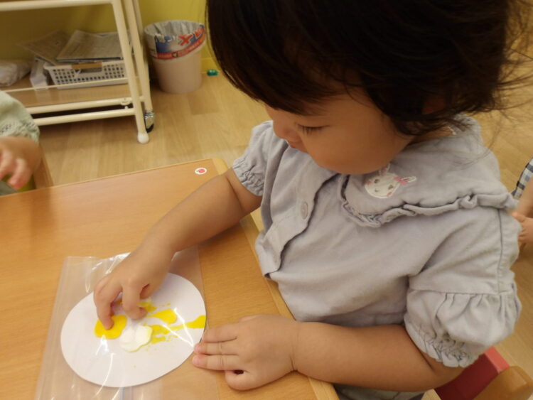 1つ目は、ジップロックに丸い紙と絵の具を入れて、指で触ってみました![]()